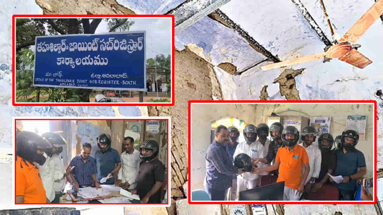 ఇకనైనా కొత్త కార్యాలయాన్ని నిర్మించండి.. ఈ వానకాలం ప్రాణాలు కాపాడండి మహా ప్రభో అంటూ హెల్మెట్లు ధరించి వినూత్న నిరసన తెలిపారు సిబ్బంది.