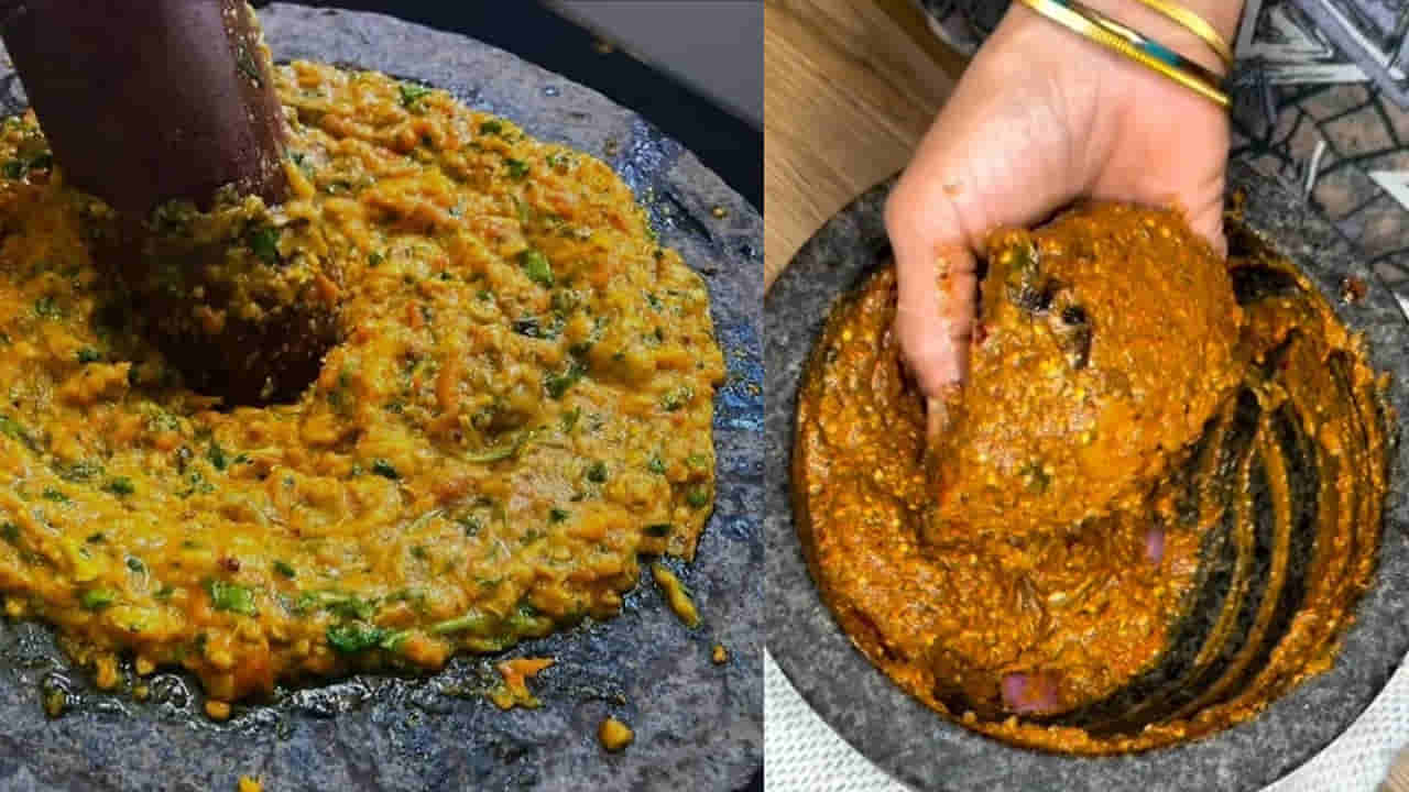 వీటిని ఇలా రోటిలో బాగా నూరుకోవాలి: ఇప్పుడు రోటిలో నాలుగు పచ్చిమిర్చి, 4 వెల్లుల్లి రెబ్బలు , పుట్నాలు వేసి దంచుకోవాలి. ఆ తరవాత ముందుగా పక్కన పెట్టుకున్న కొత్తిమీర, నిమ్మకాయంత చింతపండు, రుచికి తగినంత ఉప్పును కూడా వేసి దీనిని బాగా నూరుకోవాలి. ఇంకా దీనిలో కొద్దిగా నీరు పోసి పేస్ట్లాగా చేసుకోవాలి.