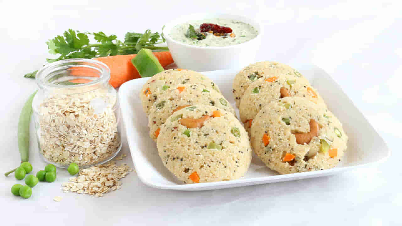 ఓట్స్ ఇడ్లీ కోసం కావలసినవి: 1 కప్పు ఓట్స్ పొడి, 1/2 కప్పు రవ్వ, 1 తురిమిన క్యారెట్, 1/2 కప్పు పెరుగు, ఆవాలు మరియు జీలకర్ర, మినపప్పు & శనగపప్పు, 1 తరిగిన పచ్చిమిర్చి, కరివేపాకు, 1/2 టీస్పూన్ పండ్ల ఉప్పు, 1 టేబుల్ స్పూన్ నూనె, రుచికి తగినంత ఉప్పు.