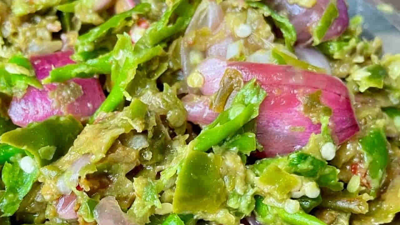 ఇప్పుడు చింతపండును తీసుకుని దానిలో వేసి రుబ్బుకోవాలి. వెల్లుల్లి రెబ్బలు, ఉప్పు కూడా వేయాలి. ఇప్పుడు ముందుగా పక్కన పెట్టుకున్న పచ్చిమిర్చి ముక్కలను వేసి వాటిని బాగా దంచుకోవాలి.