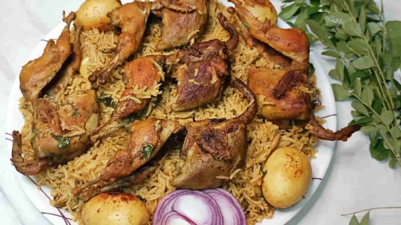 కావలసినవి: క్వాయిల్ - 4, జీలకర్ర సాంభా రైస్ - 750 గ్రాములు, పెద్ద ఉల్లిపాయ (తరిగినది) - 150 గ్రాములు, టమోటా (తరిగినది) - 100 గ్రాములు, పచ్చిమిర్చి (తరిగినది) - 5, పుదీనా ఆకులు, కొత్తిమీర ఆకులు - 50 గ్రాములు, కారం పొడి - 1 టీస్పూన్, పసుపు పొడి - 1/2 టీస్పూన్, పెరుగు - 50 మి.లీ, కొబ్బరి పాలు - 100 మి.లీ, బెరడు, ఏలకులు - 2, లవంగాలు - 4, పార్స్లీ ఆకులు - 1, అల్లం, వెల్లుల్లి పేస్ట్ - 50 గ్రాములు, ఉప్పు - అవసరాన్ని బట్టి, నూనె - 100 మి.లీ, నెయ్యి - 50 మి.లీ, దాల్చిన చెక్క - 2, ఏలకులు - 4, లవంగాలు - 6, వెల్లుల్లి - 50 గ్రాములు, అల్లం - 1 ముక్క.