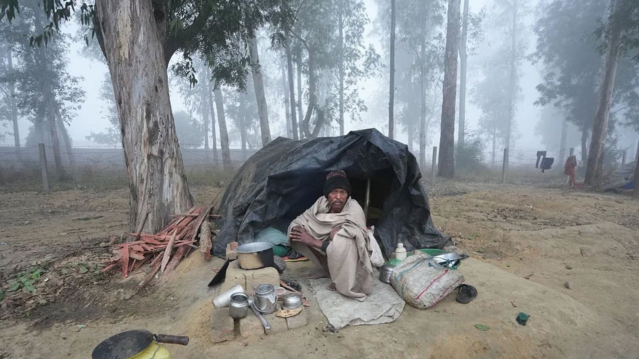ఉదయం దట్టమైన పొగమంచులో వలస కార్మికులు ఆహారం వండుకుంటున్నారు.