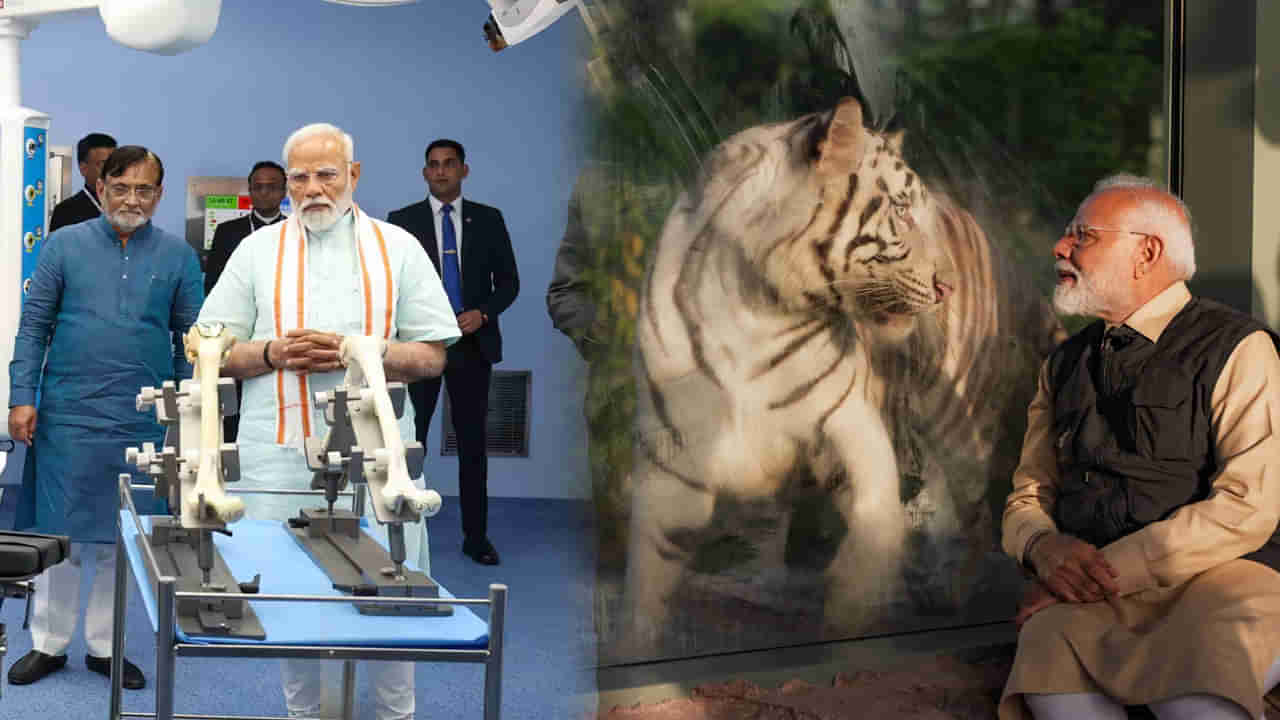 ప్రధాని మోదీ ఓ పిల్లాడితో సరదాగా గడుపుతున్న దృశ్యం ఇది. అలాగే గుజరాత్లోని వంటారాలోని వన్యప్రాణుల సంరక్షణ కేంద్రంలో ప్రధాని మోదీ తెల్ల సింహం పిల్లను ఆడిస్తున్న వేళ
