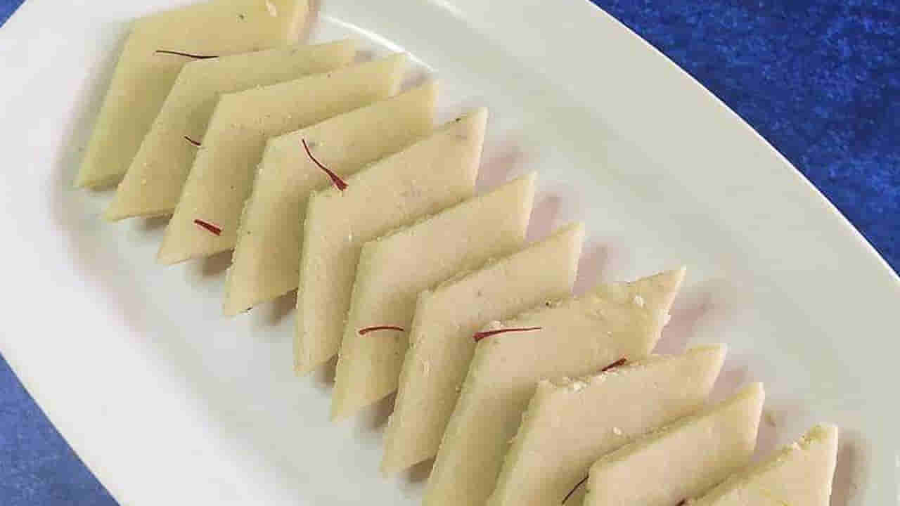 తర్వాత ఒక ఫ్లాట్ సర్ఫేస్ లేదా ప్లేట్ పై నెయ్యి రాసి ఆ మిశ్రమాన్ని ఇందులోని వేసుకొని రోలింగ్ పిన్ తో ¼ అంగుళాల మందం వచ్చేలా చదును చేయండి. మిశ్రమాన్ని కొద్దిగా చల్లారనిచ్చి వెచ్చగా ఉన్నప్పుడే డైమండ్ లేదా చతురస్రాకారంలో కట్ చేసుకోండి. కాజు కట్లి పూర్తిగా చల్లారనిచ్చి, గాలి చొరబడని డబ్బాలో నిల్వ చేయండి.