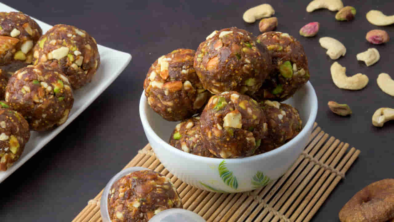 తయారీ విధానం : ముందుగా బాదం, జీడిపప్పు, వాల్నట్స్, పిస్తాపప్పులను చిన్న చిన్న ముక్కలుగా చేసుకోవాలి. తర్వాత అంజీర్ను వేడి నీటిలో పది నుంచి పదిహేను నిమిషాలు నానబెట్టాలి. తర్వాత వీటిని, అలాగే ఖర్జూరాలను ముక్కలుగా చేసి మిక్సీ పట్టాలి. ఈ పేస్టు లడ్డూ చేయడానికి బాగుంటుంది. తర్వాత ఒక పాన్ తీసుకోవాలి. అందులో ఒక టేబుల్ స్పూన్ నెయ్యి వేసి దాన్ని కాస్త వేడి చెయ్యాలి.