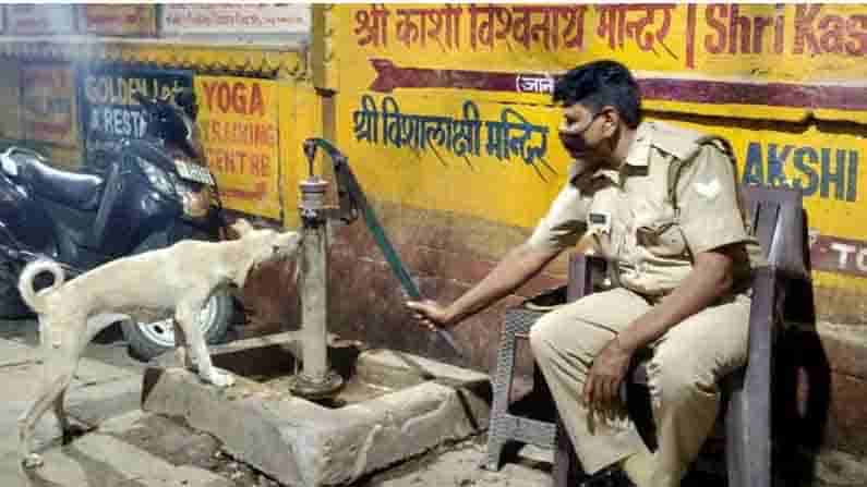 Onduty Cop helps Thirsty Dog: కరోనా కష్టాలు మనుషులనే కాదు.. మూగజీవాలనూ సైతం వదలడంలేదు. లాక్డౌన్తో వీధికుక్కలు ఆహారం లేక అవస్థలు పడుతున్నాయి. రోజుల తరబడి ఆహారం లేకుండా అలమటిస్తున్నాయి. ముఖ్యంగా నోరున్న జీవులమైన మనకు తాగునీరు ఎలాగోలా లభిస్తుంది. కాలేకడుపుతో మంచి నీటి కోసం తపిస్తున్న ఓ వీధికుక్కకు దాహార్తి తీర్చాడు విధుల్లో ఉన్న ఓ పోలీస్.