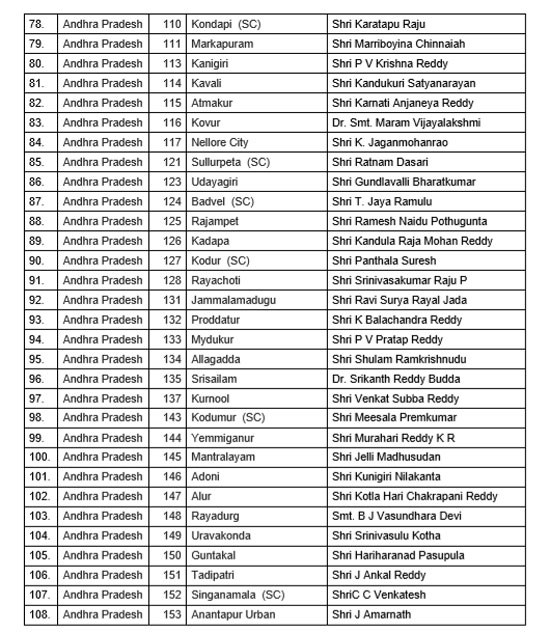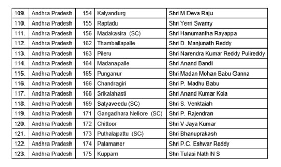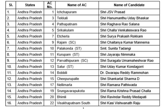 ఏపీ అసెంబ్లీ అభ్యర్థుల తొలి జాబితాను బీజేపీ విడుదల చేసింది. 123 మంది అభ్యర్థులతో కూడిన తొలి జాబితాను పార్టీ ప్రకటించింది. పార్టీ పార్లమెంటరీ బోర్డు ఆమోదం తర్వాత ఈ జాబితాను విడుదల చేసింది.