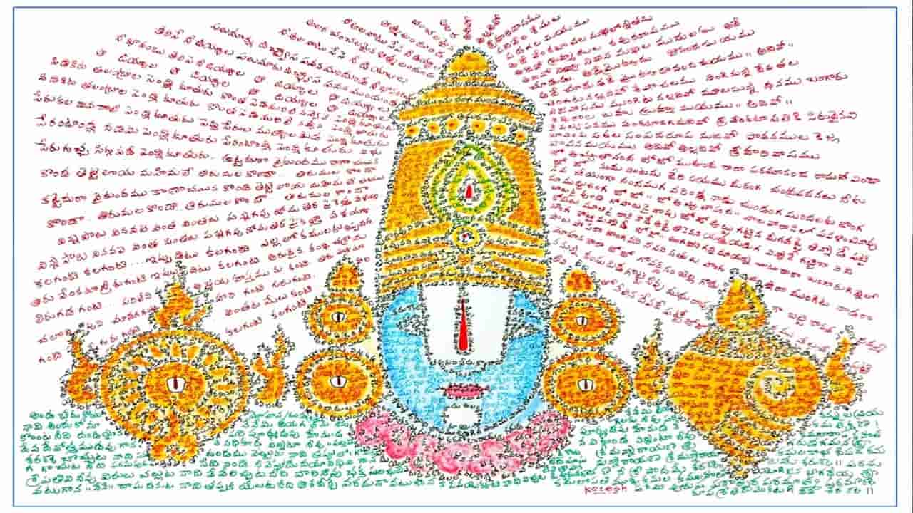 వెంకటేశ్వర స్వామికి ప్రియమైన భక్తుడైన అన్నమయ్య పూర్తి పేరు తాళ్లపాక అన్నమాచార్యులు. అయన తెలుగు సాహిత్యంలో తొలి వాగ్గేయకారుడు, పద కవిత పితామహులు. దాదాపుగా వెంకటేశ్వర స్వామి పై 32 వేల కీర్తనలు రచించి తెలుగు భాషా మాధుర్యాన్ని, భక్తిని ప్రపంచానికి చాటాడు. ఎంతో పరిపూర్ణ మైన అన్నమయ్య తెలుగు వారిగా పుట్టడం తెలుగు వారికి ఒక వరం. ఆ కారణజన్ముడు పాడిన కొన్ని కీర్తనలతో మన తెలుగు అక్షరాలతో శ్రీ వెంకటేశ్వర స్వామి చిత్రం వేసాను. ప్రతి సంవత్సరం వైకుంఠ ఏకాదశి రోజున స్వామి చిత్రాలు వేస్తూనే వున్నాను. ఈ సారి ఇలా వినూత్నంగా వేసాను. హిందు భక్తులందరికి ఆ స్వామి ఆశీస్సులు ఉండాలని చిత్రకారుడు కోరారు.