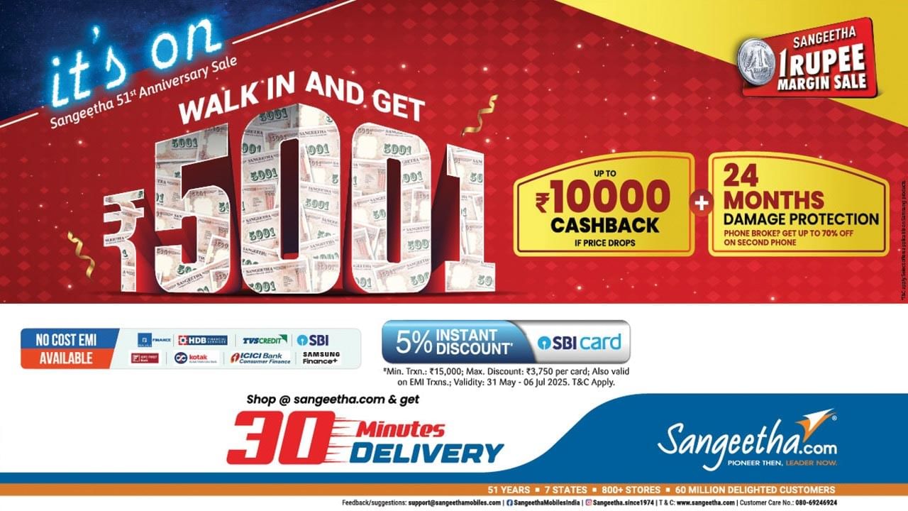 సంగీత మొబైల్స్ తన 51వ వార్షికోత్సవాన్ని జరుపుకుంటూ, "బిగ్ 51 యానివర్సరీ సేల్"ను ప్రారంభించింది. ప్రతి కస్టమర్కు రూ.5,001 ప్రయోజనం, 24 నెలల డ్యామేజ్ ప్రొటెక్షన్పై 70 శాతం తగ్గింపు, ధర తగ్గితే రూ.10,000 వరకు కాష్బ్యాక్, బైబ్యాక్ ఆఫర్లు అందిస్తోంది.