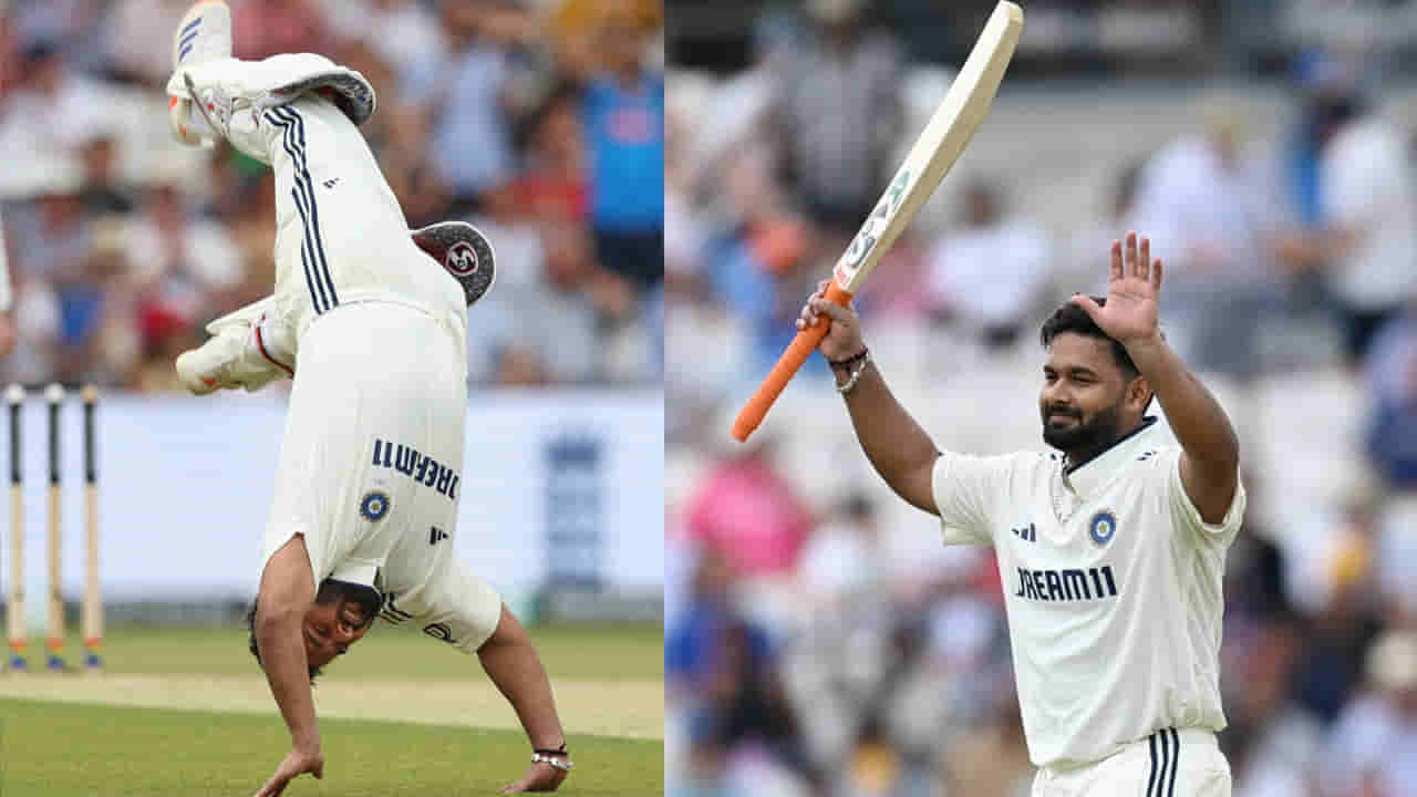 ఇంగ్లండ్ తో జరుగుతోన్న తొలి టెస్ట్ మ్యాచ్ తొలి ఇన్నింగ్స్లో టీం ఇండియా 471 పరుగులు చేసి పటిష్ఠ స్థితిలో నిలిచింది. మొదట యశస్వి జైస్వాల్, ఆ తర్వాత కెప్టెన్ శుభ్మాన్ గిల్ ఇక శనివారం వికెట్ కీపర్ అండ్ బ్యాటర్ పంత్ సెంచరీలతో మెరిశారు. శనివారం ఇంగ్లిష్ బౌలర్లను చితక బాదిన రిషబ్ తన టెస్ట్ కెరీర్లో ఏడవ సెంచరీ చేశాడు. ఇంగ్లాండ్ గడ్డపై అతనికిది మూడో సెంచరీ కావడం విశేషం. ఈ మ్యాచ్ లో రిషబ్ పంత్ 146 బంతుల్లో 10 ఫోర్లు, 4 సిక్సర్లతో సెంచరీ పూర్తి చేశాడు. 99 పరుగుల ద్ద ఒంటి చేత్తో అద్భుతమైన సిక్స్ కొట్టి తన సెంచరీ మార్కును చేరుకున్నాడు. ఇక ఎప్పటిలాగే శతకం పూర్తి కాగానే బ్యాట్ను, హెల్మెట్ను పక్కన పడేసి.. గాలిలో పల్టీ కొడుతూ వెరైటీ సెలబ్రేషన్స్ చేసుకున్నాడీ టీమిండియా బ్యాటర్. జిమ్నాస్ట్ తరహాలో గాలిలో పల్టీలు కొడుతూ ఎగిరి సంబరాన్ని షేర్ చేసుకున్నాడు. ప్రస్తుతం ఇందుకు సంబంధించిన వీడియో సామాజిక మాధ్యమాల్లో వైరల్ గా మారింది.