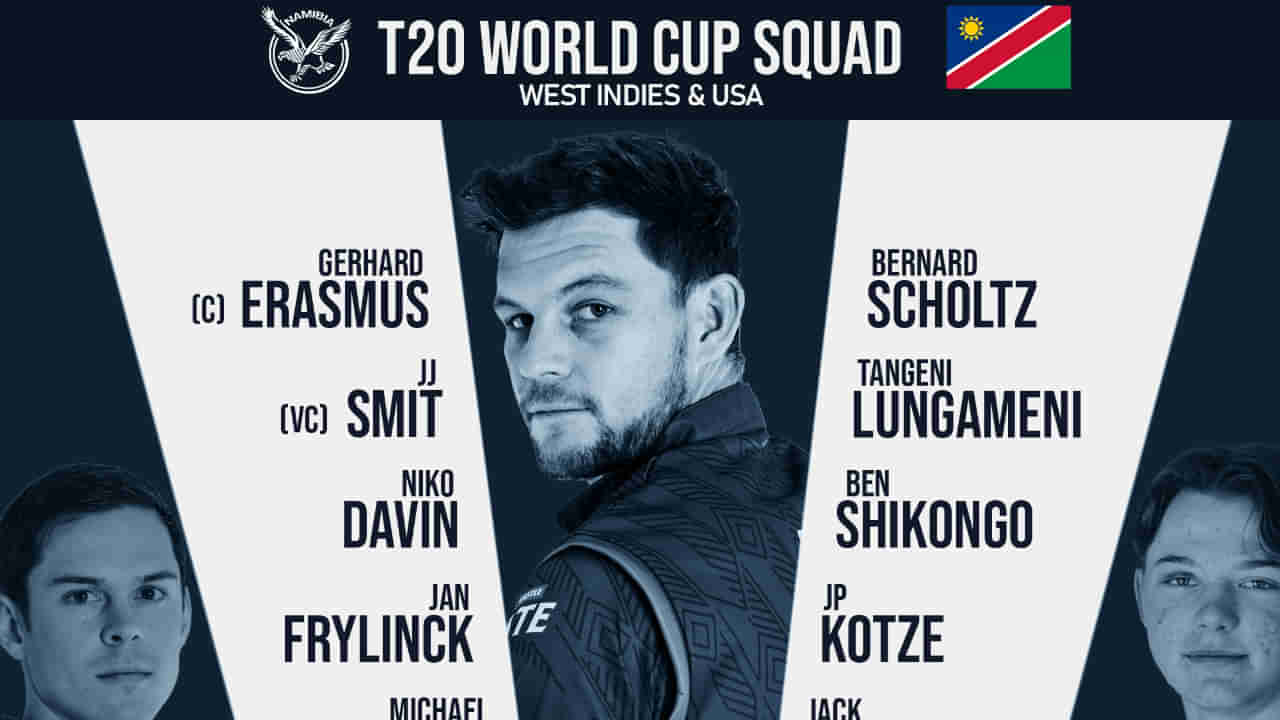 T20 ప్రపంచ కప్ 2024 కోసం నమీబియా జట్టు: గెర్హార్డ్ ఎరాస్మస్ (కెప్టెన్), జేన్ గ్రీన్, మైఖేల్ వాన్ లింగేన్, డైలాన్ లీచ్టర్, రూబెన్ ట్రంపెల్మన్, జాక్ బ్రాసెల్, బెన్ షికోంగో, టి లుంగామెని, నికోలస్ డెవ్లిన్, జెజె స్మిత్, జాన్ ఫ్రైలింక్, జెపి కోట్జే, డేవిడ్ వీజ్న్, బెర్నార్డ్ స్కోల్ట్జ్, పి మలన్ క్రుగర్, పి. బ్లిగ్నాట్.