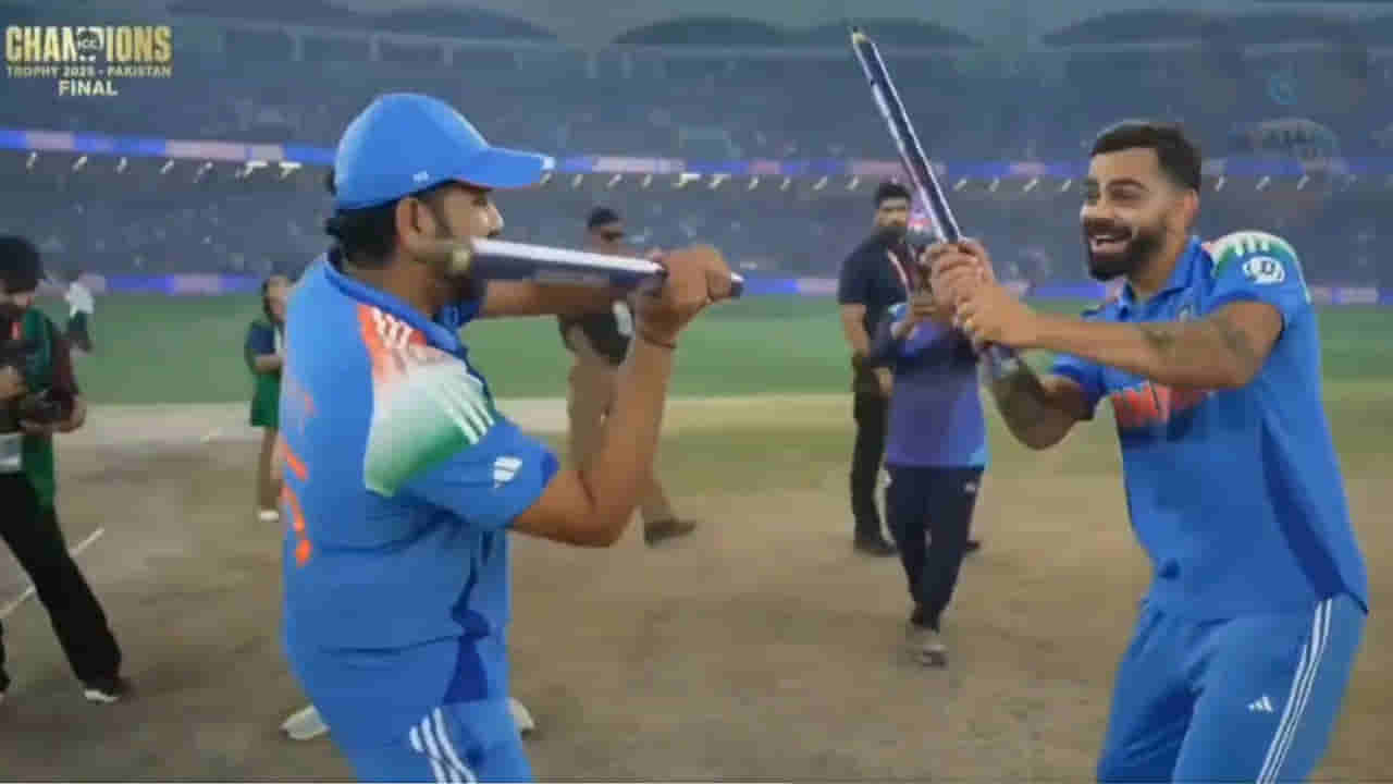 దుబాయ్ మైదానంలో న్యూజిలాండ్తో జరిగిన 252 పరుగుల ఛేదనలో టీమిండియా కెప్టెన్ రోహిత్ శర్మ 76 పరుగుల బలమైన ఇన్నింగ్స్ ఆడాడు. విరాట్ కోహ్లీ ఒక్క పరుగు మాత్రమే చేయగలిగాడు. అయితే, రోహిత్ శర్మ, విరాట్ కోహ్లీ వరుసగా రెండవసారి ఐసీసీ ట్రోఫీని గెలుచుకున్నారు. దీంతో వీరి ఆనందానికి అవధులు లేకుండాపోయాయి. వీరిద్దరూ స్టంప్లను చేతుల్లోకి తీసుకుని వాటితో కోలాటం ఆడారు. ఈ వీడియో ఇప్పుడు వైరల్ అవుతోంది.