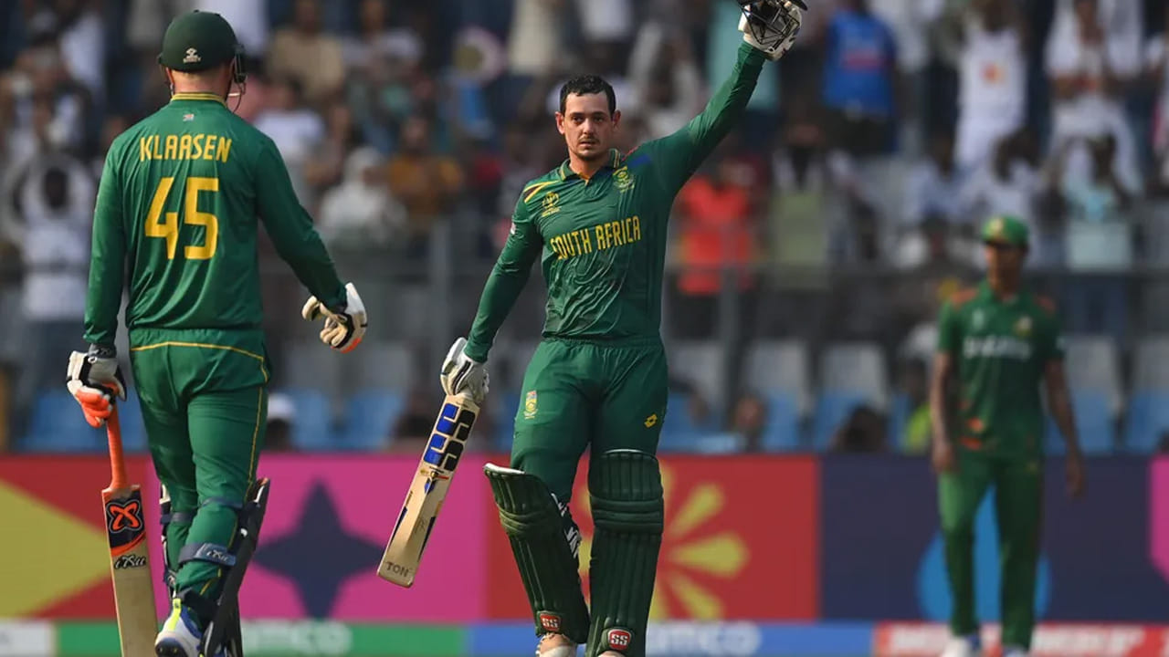 ప్రపంచకప్ 2023లో భాగంగా బంగ్లాదేశ్కు 23వ మ్యాచ్లో దక్షిణాఫ్రికా 383 పరుగుల విజయ లక్ష్యాన్ని నిర్దేశించింది. టాస్ గెలిచి బ్యాటింగ్ ఎంచుకున్న సౌతాఫ్రికా నిర్ణీత 50 ఓవర్లలో 5 వికెట్లకు 382 పరుగులు చేసింది. మంగళవారం ముంబైలోని వాంఖడే మైదానంలో దక్షిణాఫ్రికా ఓపెనర్ క్వింటన్ డి కాక్ 174 పరుగులు, కెప్టెన్ ఐడెన్ మార్క్రామ్ 60 పరుగులు, హెన్రిచ్ క్లాసెన్ 90 పరుగులు చేశారు. హసన్ మహమూద్ రెండు వికెట్లు తీయగా, మెహదీ హసన్ మిరాజ్, షోరిఫుల్ ఇస్లాం, షకీబ్ అల్ హసన్ తలో వికెట్ తీశారు.