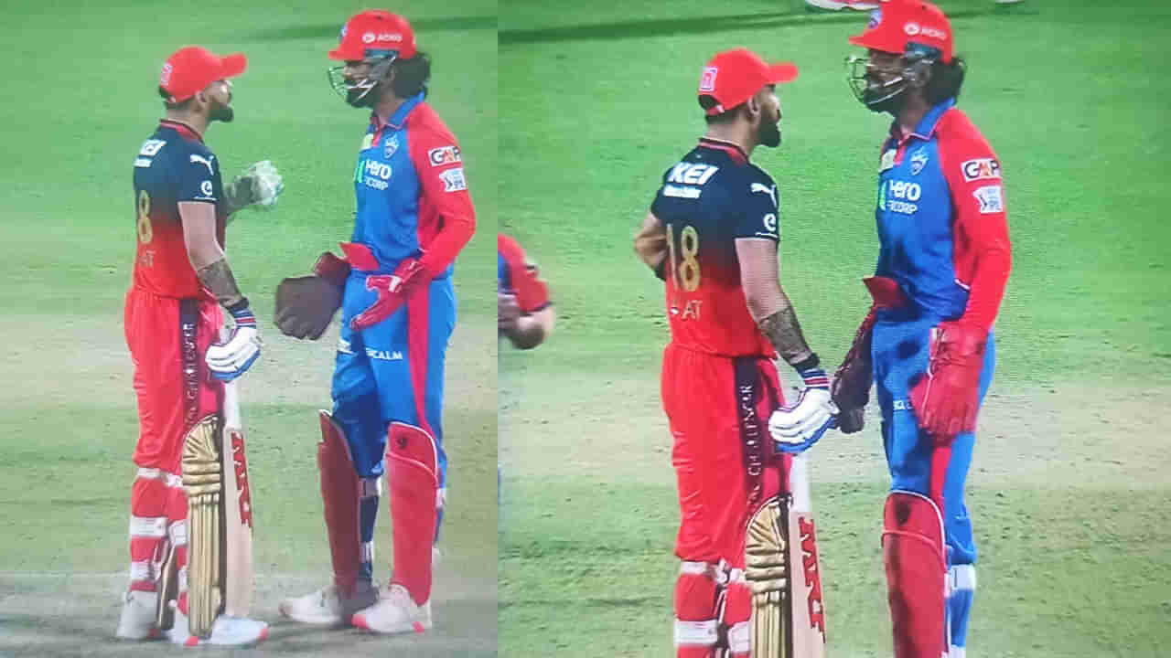 Virat Kohli and KL Rahul Fight During DC vs RCB Match: ఆదివారం అరుణ్ జైట్లీ స్టేడియంలో జరిగిన ఐపీఎల్ 2025 మ్యాచ్ సందర్భంగా రాయల్ ఛాలెంజర్స్ బెంగళూరు (RCB) స్టార్ బ్యాటర్ విరాట్ కోహ్లీ వార్తల్లో నిలిచాడు. ఢిల్లీ క్యాపిటల్స్ కీపర్-బ్యాటర్ కేఎల్ రాహుల్తో వాగ్వాదం చేస్తున్నట్లు వీడియోలు వైరలవుతున్నాయి. ముఖ్యంగా కోహ్లీ ఏదో విషయంపై తన చేతులను చూపిస్తూ కేఎల్ రాహుల్తో వాదిస్తున్నట్లు తెలుస్తోంది. ఈ వీడియో సోషల్ మీడియాలో ప్రస్తుతం తెగ వైరలవుతోంది.