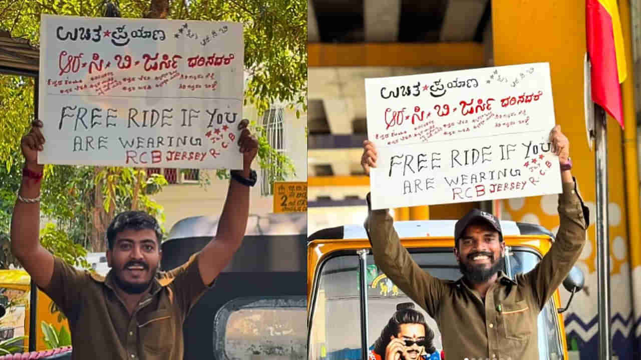 “RCB జెర్సీ ధరించినట్లయితే ఉచిత రైడ్” అని రాసి ఉన్న పెద్ద ప్లకార్డులను పట్టుకుని ఉచిత రైడ్లను ప్రకటించిందీ ఆటో డ్రైవర్స్ జంట. వారి ఫోటోలు ఇంటర్నెట్లో తుఫానుగా మారాయి. బెంగళూరుకు చెందిన ఇద్దరు ఆటోరిక్షా వాలాలు షేర్ చేసిన ఇన్స్టాగ్రామ్ పోస్ట్లు కన్నడ మరియు ఇంగ్లీష్ రెండింటిలోనూ రాసిన బోర్డులను గర్వంగా పట్టుకుని ఉన్నట్లు చూపించాయి.