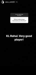 ఇండియా జట్టులోని స్టార్ క్రికెటర్లలో రాహుల్ను ఒకడని, ప్రజంట్ అతడు మంచి ఫామ్లో రాణిస్తున్నాడని స్మిత్ వివరించాడు. కాగా కేఎల్ రాహుల్ ఈ మధ్య ప్రపంచ క్రికెట్ లో తన ముద్ర వేస్తున్నాడు. ఇటీవలే ఇంగ్లాండ్ ఫాస్ట్బౌలర్ జోఫ్రా ఆర్చర్ మాట్లాడుతూ.. తాను ఎదుర్కొన్న టఫ్ బ్యాట్స్మెన్స్ లో రాహుల్ ఒకడని చెప్పాడు. ఐపీఎల్లో కింగ్స్ ఎలెవన్ పంజాజ్కు సారథిగా ఉన్న రాహుల్.. 2019 సీజన్లో ఎక్కువ రన్స్ చేసిన బ్యాట్స్మెన్స్ లో సెకండ్ ప్లేసులో నిలిచాడు.
