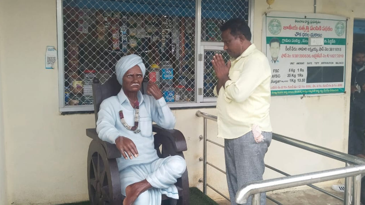 ప్రతిరోజు తండ్రి కోమరయ్య రూపాన్ని విగ్రహంలో చూస్తూ సంతోష పడుతున్నాడు. ఇతని తండ్రి తాడూరి కొమురయ్య మూడు సంవత్సరాల క్రితం మరణించారు. కొమురయ్య ఒక్కగానొక్క కుమారుడు లక్ష్మణ్. తండ్రి కొమురయ్య మరణించిన ఆయన జ్ఞాపకాలు, రూపం ఎప్పుడు తన కళ్లెదుటే ఉండాలనే ఉద్దేశంతో కుమారుడు లక్ష్మణ్ తండ్రి కొమురయ్య విగ్రహాన్ని ప్రత్యేకంగా చేయించుకోని తన ఇంటి ఎదుట ప్రతిష్టించు కున్నాడు. ప్రతిరోజు తన తండ్రి విగ్రహంకు పూజ చేసి మొక్కిన తర్వాతే ఏ పని అయిన మొదలు పెడతాడు లక్ష్మణ్.
