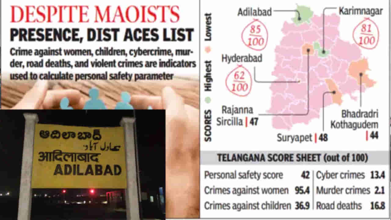 తెలంగాణ రాష్ట్రంలో మారుమూల ప్రాంతంగానే కాక మావోయిస్టు ప్రాబల్యం ఎక్కువగా ఉన్న ఆదిలాబాద్ జిల్లా ఎవరూ ఊహించని రీతిలో అత్యంత అరుదైన ఘనతను తన సొంతం చేసుకుంది. తెలంగాణ రాష్ట్రంలోనే అత్యంత సురక్షితమైన జిల్లాగా అగ్రస్థానం సాధించింది అదిలాబాద్. ప్రధానమంత్రి ఆర్థిక సలహా మండలి సామాజిక ప్రగతి సూచిక ఇటీవల విడుదల చేసిన ‘సురక్షితమైన జిల్లాల నివేదిక’లో అదిలాబాద్ కూడా ఉంది. ఇంకా ప్రత్యేకంగా చెప్పుకోదగిన విషయం ఏమిటంటే.. ‘వ్యక్తిగత భద్రత సూచిక’లో దేశంలోనే అత్యంత సురక్షితమైన జిల్లాల జాబితాలో ఐదో స్థానాన్ని అదిలాబాద్ దక్కించుకుంది. ఆదిలాబాద్ జిల్లా పోలీసు వ్యవస్థ పనితీరుకు నిదర్శనంగా ఈ భద్రత ర్యాంకింగ్స్ రావడం విశేషం. ఈ సందర్భంగా జిల్లా ఎస్పీ డీ ఉదయ్ కుమార్ రెడ్డికి ప్రముఖుల ద్వారా అభినందనలు వెల్లువెత్తాయి.