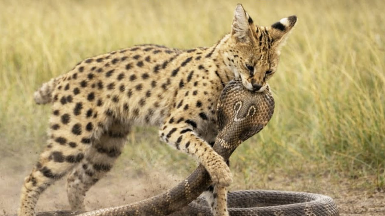 సర్వల్ క్యాట్: ఈ అడవి పిల్లికి అద్భుతమైన వేట నైపుణ్యం ఉంది. పాము కనపడితే 12 అడుగుల ఎత్తు వరకు ఎగిరి పట్టుకొని చంపుతుంది. ఇది చాలా అప్రమత్తంగా వేటాడుతుంది, పాము కాటుకు గురికాకుండా సెకన్లలో తప్పించుకుంటుంది. ఆఫ్రికాలో కనిపిస్తుంది. కొన్నిసార్లు పెంపుడు జంతువుగా కూడా పెంచుతారు.