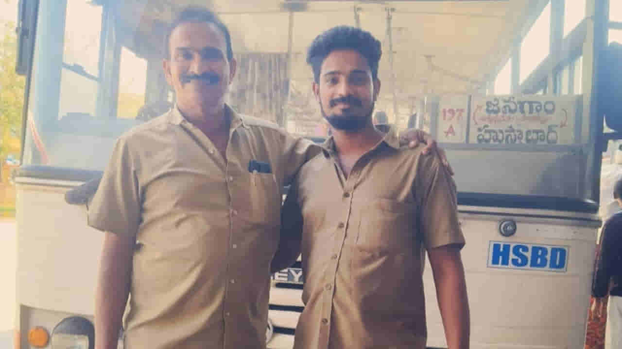 సాధారణంగా ఒకే కుటుంబంలో ఇద్దరు వ్యక్తులు ఒకే వృత్తిలో ఉండటం చూస్తుంటాం. కానీ విధి నిర్వహణలో తండ్రీకొడుకులు ఒకే బస్సులో కలిసి పనిచేయడం చాలా అరుదుగా జరుగుతుంది. అలాంటి ఒక ఆసక్తికరమైన, మధురమైన సన్నివేశం సిద్దిపేట జిల్లా హుస్నాబాద్ ఆర్టీసీ డిపోలో చోటుచేసుకుంది. హుస్నాబాద్ బస్టాండ్లో శుక్రవారం ఒక బస్సు ప్రయాణికులందరినీ ఆశ్చర్యపరిచింది. ఆ బస్సు స్టీరింగ్ పట్టుకొని డ్రైవర్ సీట్లో తండ్రి ఉంటే.. ప్రయాణికులకు టికెట్లు ఇస్తూ కొడుకు కండక్టర్గా కనిపించారు. బంధనాపురం ఎల్లయ్య హుస్నాబాద్ డిపోలో గత 34 ఏళ్లుగా డ్రైవర్గా సేవలందిస్తున్నారు. ఆయన కుమారుడు ప్రేమ్ అదే డిపోలో కండక్టర్గా నియమితులయ్యారు. విధి నిర్వహణలో భాగంగా వీరిద్దరికీ ఒకే బస్సులో డ్యూటీ పడటంతో ఈ అరుదైన దృశ్యం ఆవిష్కృతమైంది.