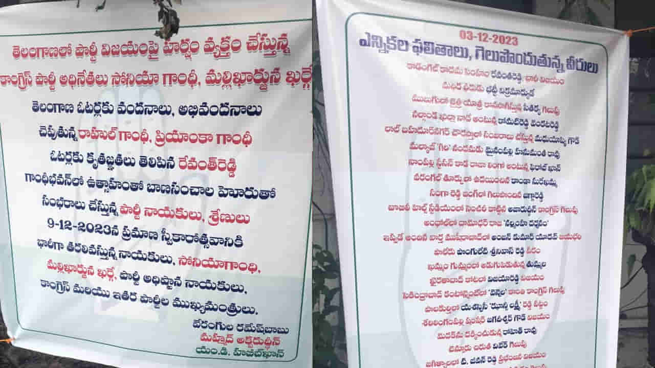 తెలంగాణ అసెంబ్లీ ఎన్నికల ఫలితాలు వెలువడనున్న తరుణంలో గాంధీభవన్ వద్ద ఫ్లెక్సీలు కలకలం సృష్టిస్తున్నాయి. తెలంగాణ అసెంబ్లీ ఎన్నికల ఫలితాలు, గెలుపొందుతున్న వీరులు అంటూ ఫ్లెక్సీలు ఏర్పాటు చేశారు. ముందుగా తెలంగాణలో పార్టీ విజయంపై హర్షం వ్యక్తం చేస్తున్న కాంగ్రెస్ పార్టీ అధినేతలు సోనియా గాంధీ, మల్లిఖార్జున ఖర్గే అంటూ హెడ్డిం పెట్టి ఫ్లెక్సీలను ఏర్పాటు చేశారు. తెలంగాణ ఓటర్లకు వందనాలు, అభివందనాలు చెబుతున్న రాహుల్ గాంధీ, ప్రియాంక గాంధీ అని ప్రచురించారు. ఓటర్లలకు రేవంత్ రెడ్డి కృతజ్ఞతలు చెబుతున్నట్లు ఇందులో పేర్కొన్నారు. ఈ ఫ్లెక్సీని వేరంగుల రమేష్ బాబు అనే వ్యక్తి ఏర్పాటు చేసినట్లు అతని పేరుతో పాటూ మరో ఇద్దరి పేర్లు ముద్రించారు. అలాగే నియోజకవర్గాల వారీగా గెలుపొందుతున్న అభ్యర్థుల జాబితాను ఇందులో పొందుపరచడం సంచలనంగా మారింది. కౌంటింగ్ ప్రక్రియ ఇప్పుడిప్పుడే ప్రారంభమైన తరుణంలో ఇలాంటివి వెలుగులోకి రావడం రాజకీయంగా ఆసక్తికరంగా మారింది.