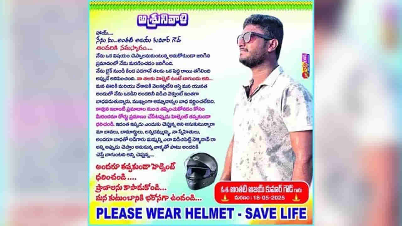చేతికి అంది వచ్చిన కొడుకు రోడ్డు ప్రమాదంలో చనిపోవడంతో తల్లిదండ్రులు కన్నీరు మున్నీరుగా విలపిస్తున్నారు. తీరని గర్భశోకంతో ఆ తల్లిదండ్రులు అల్లాడిపోయారు.తల్లిదండ్రులు నిర్వహించిన అజయ్ కుమార్ గౌడ్ దశదినకర్మ కార్యక్రమంలో ఫ్లెక్సీలను ఏర్పాటు చేశారు. ఈ ఫ్లెక్సీల్లో.. ‘నేను హెల్మెట్ ధరించి ఉంటే ఈ రోజు మీ అందరితో కలిసి ఉండేవాడిని.. బైక్ నడిపే ప్రతిఒక్కరూ తప్పనిసరిగా హెల్మెట్ను ధరించాలి’ అంటూ అజయ్ కుమార్గౌడ్ మాట్లాడినట్లుగా కుటుంబ సభ్యులు ఫ్లెక్సీలను ఏర్పాటు చేశారు. ఈ పోస్టర్లను గ్రామంలోని రెండు చోట్లు ఏర్పాటు చేశారు.