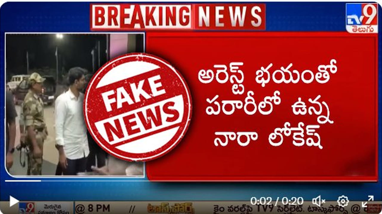 సోషల్ మీడియాలో "అరెస్ట్ భయంతో పరారీలో ఉన్న నారా లోకేష్" అంటూ టీవీ9 పేరిట వస్తున్న వార్త పూర్తిగా ఫేక్ న్యూస్.