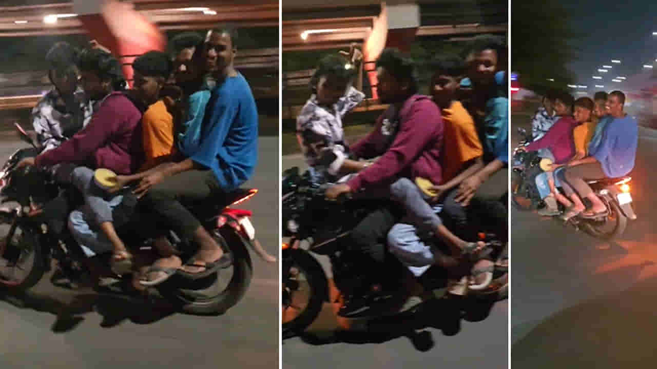 బైక్ ఒక్కటే.. మహా అయితే.. దానిపై ఇద్దరు వెళ్లొచ్చు.. అతి కష్టం మీద మరొకరు కూర్చోవచ్చు.. కానీ.. ఓ ద్విచక్రవాహనంపై ఐదుగురు యువకులు ప్రయాణిస్తూ.. హల్ చల్ చేశారు. అది కూడా హై సెక్యూరిటీ ఉండే ప్రాంతంలో.. స్టంట్లు చేస్తూ ఎంజాయ్ చేశారు. ఈ షాకింగ్ ఘటన హైదరాబాద్ నగరంలోని సైఫాబాద్ లో చోటుచేసుకుంది. ట్రాఫిక్ నిబంధనలను అతిక్రమించి, అత్యంత ప్రమాదకర రీతిలో ఒకే బైక్పై ఐదుగురు ప్రయాణించిన ఘటనలో.. సైఫాబాద్ పోలీసులు రాపిడో డ్రైవర్తో సహా ఐదుగురిని అరెస్ట్ చేశారు. సోషల్ మీడియాలో వైరల్ అయిన వీడియో ఆధారంగా పోలీసులు ఈ చర్య తీసుకున్నారు. గత నెల మార్చి 29, 2026 అర్ధరాత్రి సుమారు 01:00 గంటల సమయంలో, తెలంగాణ తల్లి ఫ్లైఓవర్ జంక్షన్ నుండి టీజీ సెక్రటేరియట్ వైపు వెళ్తున్న ఒక నలుపు రంగు పల్సర్ బైక్ (నెం: TG 09 K 2918) పై ఐదుగురు వ్యక్తులు అత్యంత నిర్లక్ష్యంగా విన్యాసాలు చేస్కతూ.. ప్రయాణించారు.