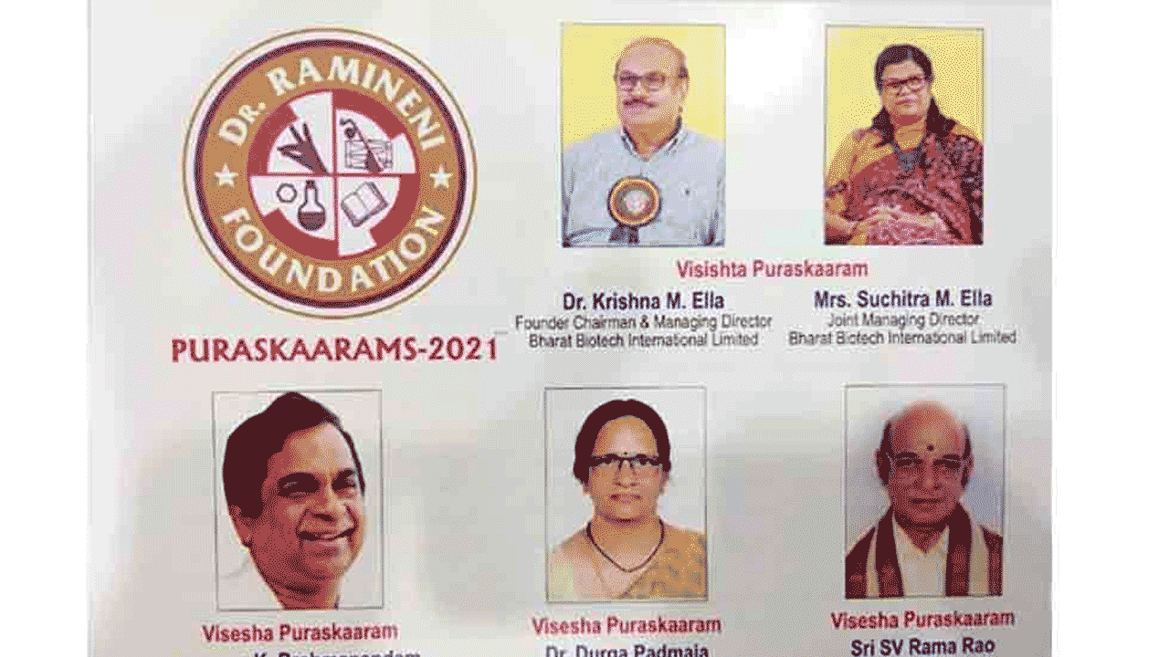 2021 సంవత్సరానికి గాను భారత్ బయోటెక్ ఇంటర్నేషనల్ లిమిటెడ్ వ్యవస్థాపక చైర్మన్ అండ్ మేనేజింగ్ డైరెక్టర్ డాక్టర్ కృష్ణ ఎం.ఎల్ల, భారత్ బయోటెక్ ఇంటర్నేషనల్ లిమిటెడ్ జాయింట్ మేనేజింగ్ డైరెక్టర్ సుచిత్ర ఎం.ఎల్ల, తెలుగు సినీ హాస్య నటుడు బ్రహ్మానందం, నిమ్స్ ఆస్పత్రి ఎనస్థీషియాలజీ విభాగాధిపతి ప్రొఫెసర్ డాక్టర్ దుర్గాపద్మజ, తెలుగు సినిమా జర్నలిస్ట్ ఎస్వీ రామారావులు పురస్కారాలు అందుకుంటారు.
