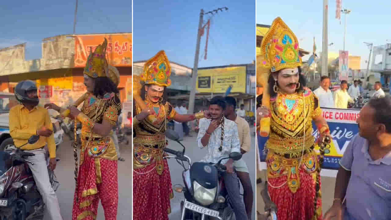 రోడ్డూ ప్రమాదాల నివారణకు పోలీసులు రకరకాల వినూత్న ప్రయత్నాలు చేస్తున్నారు. ఉచితంగా హెల్మెట్ల పంపిణీ, రీల్స్ ద్వారా అవగాహన కార్యక్రమాలు నిర్వహిస్తున్నారు. అంతేకాకుండా.. రోడ్ల ప్రమాదాల నివారణకు అన్ని ప్రాంతాల్లో విస్తృతంగా అవగాహన కల్పిస్తున్నారు. అయితే నిజామాబాద్ జిల్లాలో ఓ ఎస్ఐ మరింత వినూత్నంగా రోడ్డు ప్రమాదాల నివారణ కోసం అవగాహన కార్యక్రమం చేపట్టారు. ఈ విజువల్స్ చూసి నడి రోడ్డుపై యమధర్మ రాజు నాటక ప్రదర్శన జరుగుతుందనుకుంటే పొరపాటే.. యమ ధర్మరాజు వేషాధారణాలో ఉన్న వ్యక్తి ఒక పోలీస్ అధికారి.. నిజామాబాద్ జిల్లా ఏర్గట్ల పోలిస్ స్టేషన్ లో ఎస్ఐ గా పని చేస్తున్న పడాల రాజేశ్వర్.. రోడ్డు ప్రమాదాల నివారణ కోసం చేపట్టిన అవగాహన కార్యక్రమంలో భాగంగా ఇలా యమ ధర్మరాజు వేషంవేశారు..