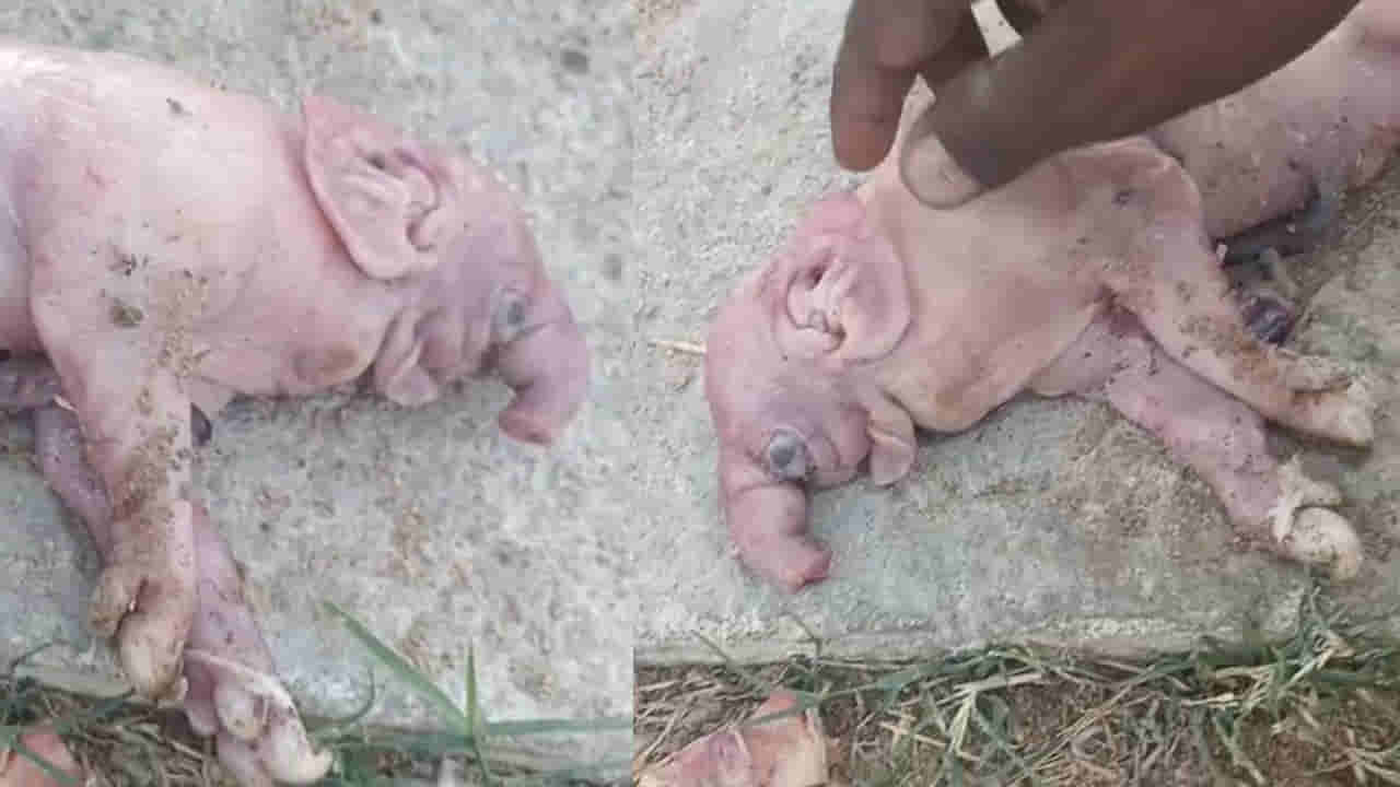 నాగర్ కర్నూల్ జిల్లాలో వింత ఘటన చోటు చేసుకుంది. పంది కడుపులో ఏనుగు పిల్ల ఆకారంలో పిల్ల జన్మించింది. పెద్దకొత్తపల్లి మండలం కార్పాముల గ్రామంలో ఈ సంఘటన వెలుగు చూసింది. గ్రామానికి చెందిన కురాకుల వెంకటయ్య అనే వ్యక్తి పందులను పెంచుతూ జీవనోపాధి పొందుతున్నాడు. ఇంటి ఆవరణలోనే ఓ చిన్న పందిరి వంటి నిర్మాణంలో పందులను పోషిస్తూ ఆదాయం సమకూర్చుకుంటున్నాడు. అయితే అందులో ఒక పంది మొదటి ఈతలో ఏడు పిల్లలకు జన్మనిచ్చింది. మొదట సంతోషం వ్యక్తం చేసిన యజమాని తర్వాత ఒక్కసారిగా షాక్ కు గురయ్యాడు. ఏడు పంది పిల్లల్లో ఒకటి అచ్చం ఏనుగు ఆకారాన్ని పోలి ఉండడంతో ఆశ్చర్యానికి లోనయ్యాడు.