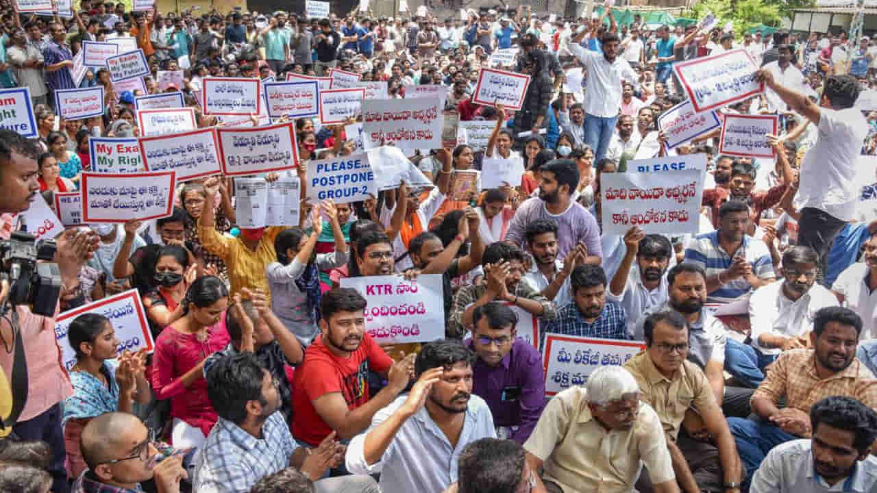 తెలంగాణలో గ్రూప్ 2 పరీక్ష వాయిదాలని డిమాండ్ చేస్తూ గురువారం ఉదయం నుండి సాయంత్రం వరకు టీఎస్పీఎస్సీ ఎదుట అభ్యర్థులు ఆందోళన నిర్వహించారు. ఆగస్టు 29, 30 తేదీలలో గ్రూప్ టూ పరీక్ష నిర్వహించేందుకు ఇప్పటికే టీఎస్పీఎస్సీ షెడ్యూల్ విడుదల చేసింది. అయితే గ్రూప్ 2 పరీక్షను రెండు నెలలపాటు వాయిదా వేయాలని అభ్యర్థులు డిమాండ్ చేస్తున్నారు. అంతకుముందు గ్రూప్ 2 వాయిదా కోరుతూ టీఎస్పిఎస్సీ కార్యాలయం బయట వేల సంఖ్యలో అభ్యర్థులు నిరసన వ్యక్తం చేశారు. పోలీసులు అభ్యర్థులను చదరగొట్టేందుకు నానా తంటాలు పడాల్సి వచ్చింది.. టీఎస్పీఎస్సీ బయట ఉదయం నుండి సాయంత్రం వరకు ఉద్రిక్తత వాతావరణం కొనసాగింది. ఇదే తరుణంలో గ్రూప్ 2 పరీక్షకు అప్లై చేసిన 150 మంది అభ్యర్థులు కలిసి హైకోర్టులో పిటిషన్ దాఖలు చేశారు.