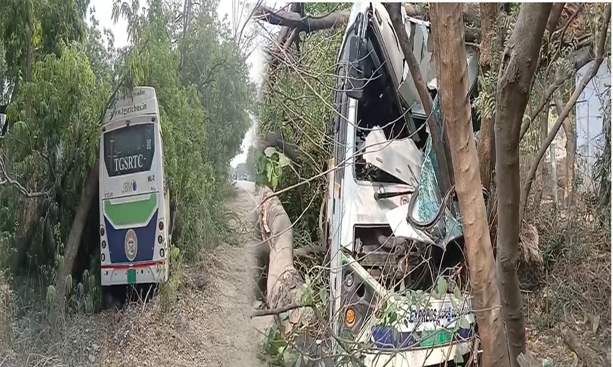 హన్మకొండ జిల్లాలో పెను ప్రమాదం తప్పింది. 50 మంది ప్రయాణికులతో నిజామాబాద్ నుంచి హన్మకొండ వైపు వెళ్తున్న ఆర్టీసీ బస్సు అదుపుతప్పి ట్రాన్స్ఫార్మర్ పక్క నుంచి ముళ్లపొదల్లోకి దూసేకెళ్లి చెట్టును ఢీకొట్టింది. ప్రమాదంలో ప్రయాణికులు స్వల్పగాయాలతో బయటపడగా..తీవ్రంగా గాయపడిన డ్రైవర్ను MGM హాస్పిటల్కు తరలించారు.