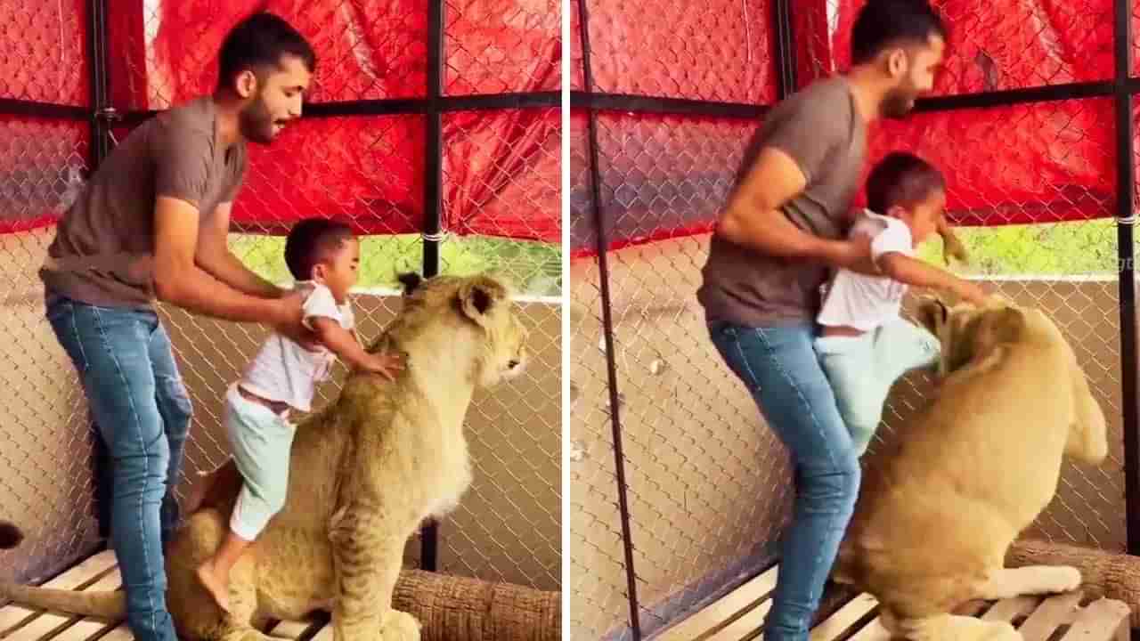 తండ్రి బలవంతంగా పిల్లవాడిని సింహం వీపుపై కూర్చోబెట్టిన వీడియో ఇక్కడ చూడండి.