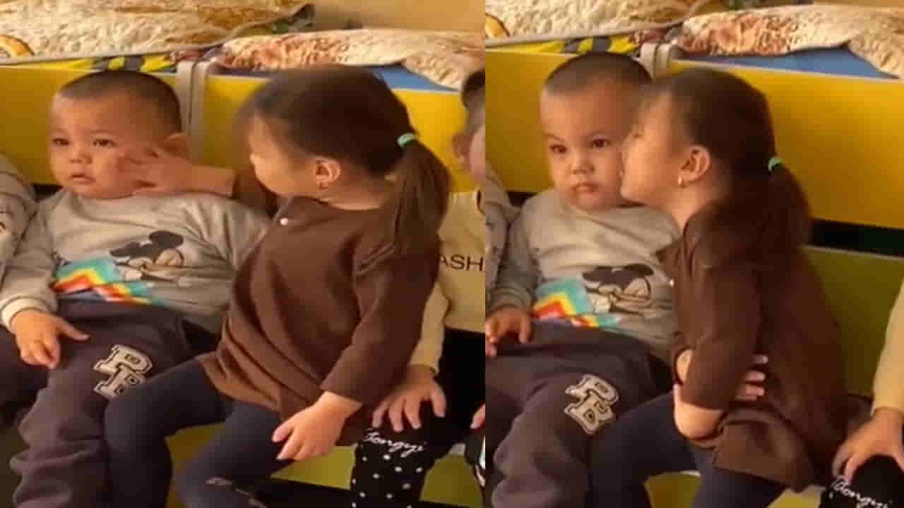 వైరల్ అవుతున్న వీడియోలో.. కొందరు చిన్నారులు బెంచీపై కూర్చుని ఉండటాన్ని చూడవచ్చు. అక్కడ ఉన్న ఓ చిన్నారి.. తమ పక్కన కూర్చున్న బుడతడిని ఇబ్బంది పెదుతుంది. చెంపపై కొడుతుంది. మోచేత్తో పొట్టపై కొడుతుంది. ఆ తర్వాత క్యూట్ గా చెంపపై ముద్దులు పెడుతుంది. ఒకానొక దశలో సహనం కోల్పోయిన ఆ బాలుడు.. అలా చేయకూడదని కంటితో సైగ చేస్తాడు. దీంతో కొంత సమయం ఆగి.. మళ్లీ ఇబ్బంది పెట్టడం స్టార్ట్ చేస్తుంది. అయినా.. ఆ పిల్లవాడు ఏ మాత్రం చలించకుండా టీచర్ చెప్పే పాఠాన్ని ఇంట్రెస్టింగ్ గా వినడాన్ని వీడియోలో చూడవచ్చు.