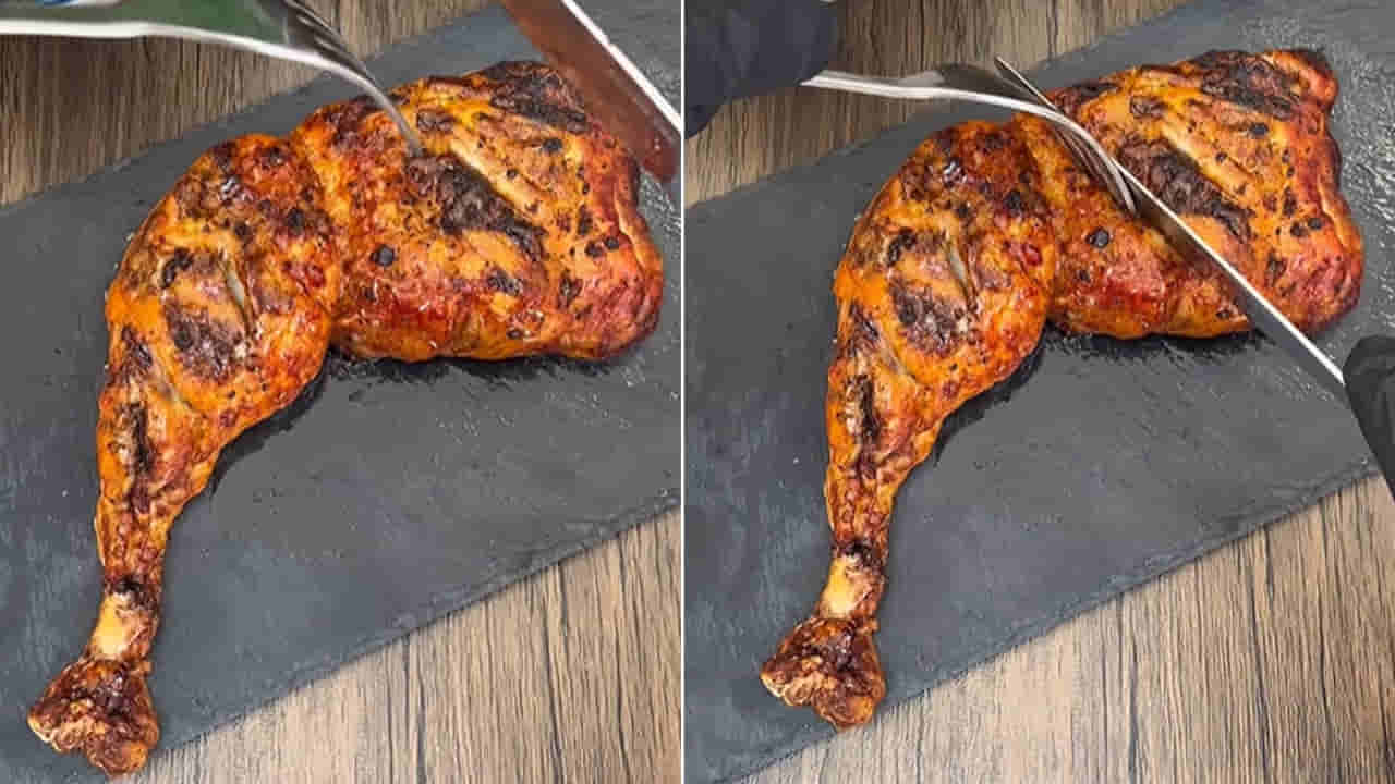 కస్టమర్లను ఆకట్టుకునేందుకు రకరకాల మార్గాలను ఎంచుకుంటుంటారు. సోషల్ మీడియా విస్తృతి పెరిగిన తర్వాత ఇలాంటి వాటికి సంబంధించిన వీడియోలు, ఫొటోలు నెట్టింట తెగ వైరల్ అవుతున్నాయి. తాజాగా ఇలాంటి ఓ వీడియో నెటిజన్లను తెగ ఆకట్టుకుంటోంది. ఈ వీడియోలో ఓ వ్యక్తి చికెన్ లెగ్ పీస్ను కట్ చేస్తున్నట్లు ఉంది. అయితే ఆ తర్వాత కానీ తెలియలేదు అది చికెన్ కాదని, ఒక కేక్ అని. అవును నిజమో అది కేక్.