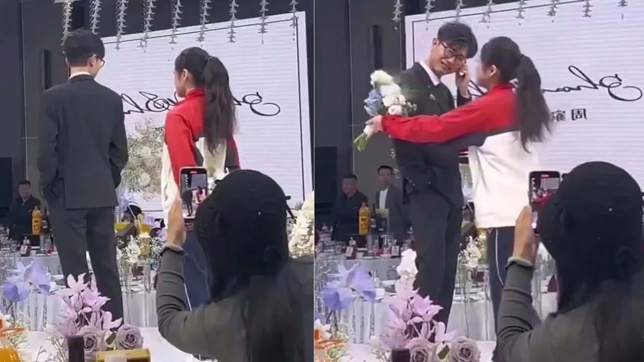 వివాహ వేదిక ప్రవేశ ద్వారం గుండా ఒక యువతి లోపలికి ప్రవేశించింది. ఆమె స్కూల్ యూనిఫాం ధరించి, పూల గుత్తి పట్టుకుని ఉంది. ఆ తర్వాత ఆమె నేరుగా పెళ్లి వేదిక వద్దకు వెళ్లింది. అక్కడ వరుడు సూట్, బూట్ ధరించి, దర్జాగా నిలబడి ఉన్నాడు. ఇంతలో వెనక్కు నిలబడి ఉన్న వరుడిని పలకరించిన యువతి అతనికి బొకే ఇచ్చింది. వచ్చింది ఎవరో చూసి వరుడు షాక్ అయ్యాడు. వెంటనే ఆనందం తట్టుకోలేక ఏడ్చేశాడు. తన వధువును స్కూల్ యూనిఫాంలో చూసినప్పుడు, అతను మొదట ఆశ్చర్యపోయాడు, కానీ తరువాత భావోద్వేగానికి గురయ్యాడు. అతని కళ్ళలో నీళ్ళు తిరిగాయి. ఆ అమ్మాయి వెంటనే అతన్ని కౌగిలించుకుంది. ఈ వీడియో వేగంగా సోషల్ మీడియాలో వైరల్ అయింది.