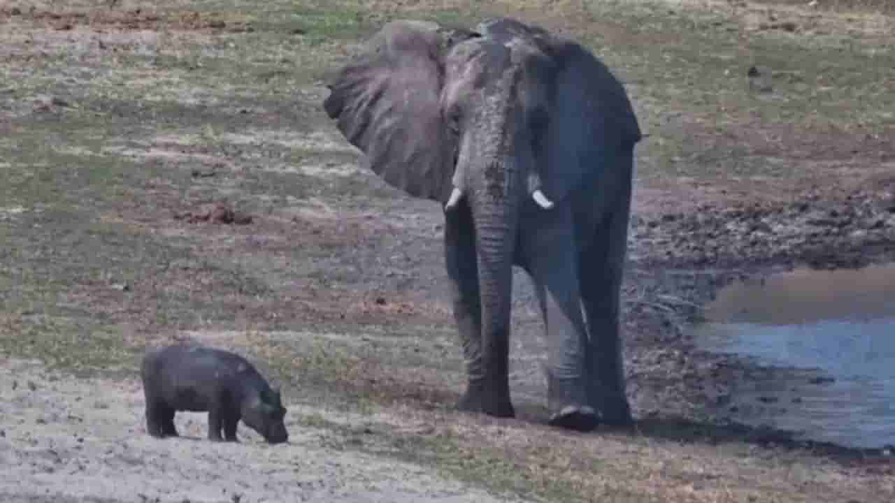 కొన్ని హిప్పోలు అటవీ ప్రాంతంలోని చెరువులాంటి ప్రాంతంలో విశ్రాంతి తీసుకుంటున్నాయి. ఒక ఏనుగు సమీపంలో నిలబడి ఉంది. అత్యంత వినోదాత్మకమైన విషయం ఏమిటంటే, ఒక పిల్ల హిప్పో ఏనుగు ముందు నడుస్తోంది. ఆ పిల్లను చూసిన ఏనుగు త్వరగా దగ్గరకు వచ్చి దానిని తన కుటుంబాన్ని తిరిగి చేరుకునేలా భయపెట్టడానికి ప్రయత్నిస్తుంది. అయితే, పిల్ల హిప్పో కొంచెం కొంటెగా ఉండి వెళ్ళడానికి నిరాకరించింది. అది నెమ్మదిగా క్రూరమైన మొసళ్ళతో నిండిన చెరువు వైపు కదిలింది. పిల్ల హిప్పోకు ముందు ఏనుగు కవచంగా నిలబడి, ఏ మొసలి దానిపై దాడి చేయకుండా నిరోధించింది. తద్వారా పిల్ల హిప్పో ప్రాణాలతో బయటపడింది.