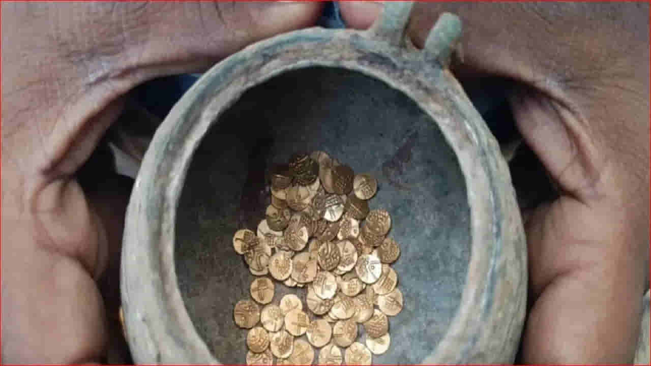తమిళనాడులోని తిరుపత్తూరు జిల్లా సుందరంపల్లి గ్రామంలో ఓ రైతు పొలంలో మట్టి కుండలో పురాతన బంగారు నాణేలు బయటపడ్డాయి. ఈ విషయం స్థానికంగా పెద్ద చర్చకు దారి తీసింది. స్థానికంగా నివాసముండే 55 ఏళ్ల అదవన్ అనే రైతు.. తనకున్న నాలుగు ఎకరాల వ్యవసాయ భూమిని చదును చేస్తున్నాడు. పొలంలో పెద్ద పెద్ద రాళ్లు ఉండటంతో.. వాటిని జేసీబీ సాయంతో డిసెంబర్ 22న తీయడంతో పాటు తవ్వకాలు మొదలుపెట్టాడు. అదే సమయంలో జేసీబీకి మట్టిలో ఏదో తగిలినట్టు అనిపించింది. మట్టిలో పాతిపెట్టిన దాన్ని తవ్వి తీసి చూడగా.. లోపల మెరిసే బంగారు నాణేలు కనిపించాయి.
