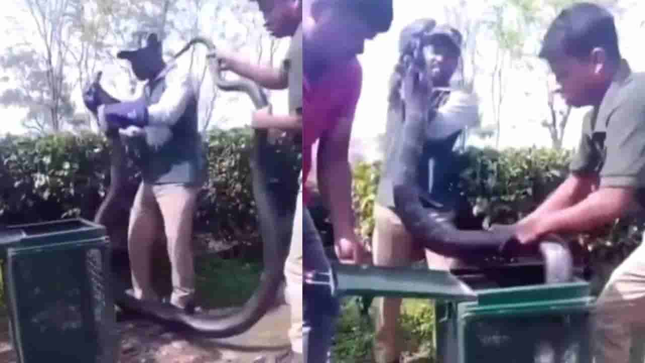 ఈ వీడియోలో , కొంతమంది అటవీ శాఖ ఉద్యోగులు ఒక పెద్ద కింగ్ కోబ్రాను పట్టుకుని మెష్ బాక్స్లో ఉంచడానికి ప్రయత్నించారు. ఆ పాము పరిమాణం చాలా పెద్దది కాబట్టి చూడటానికి భయంకరంగా ఉంది. అయితే, ఒక అటవీ శాఖ ఉద్యోగి కింగ్ కోబ్రా నోటిని పట్టుకోగా, మరొకరు దాని తోకను పట్టుకున్నారు. దీని తరువాత, మెష్ బాక్స్లో ఉంచే ప్రక్రియ ప్రారంభమైంది. అతి కష్టం మీద అటవీ శాఖ ఉద్యోగులు దానిని పెట్టె లోపల ఉంచారు. అదృష్టవశాత్తూ, ఈ సమయంలో కింగ్ కోబ్రా వారిపై దాడి చేయడానికి ప్రయత్నించలేదు, లేకుంటే తీవ్ర పరిణామాలను ఎదుర్కొవల్సి వచ్చేది.