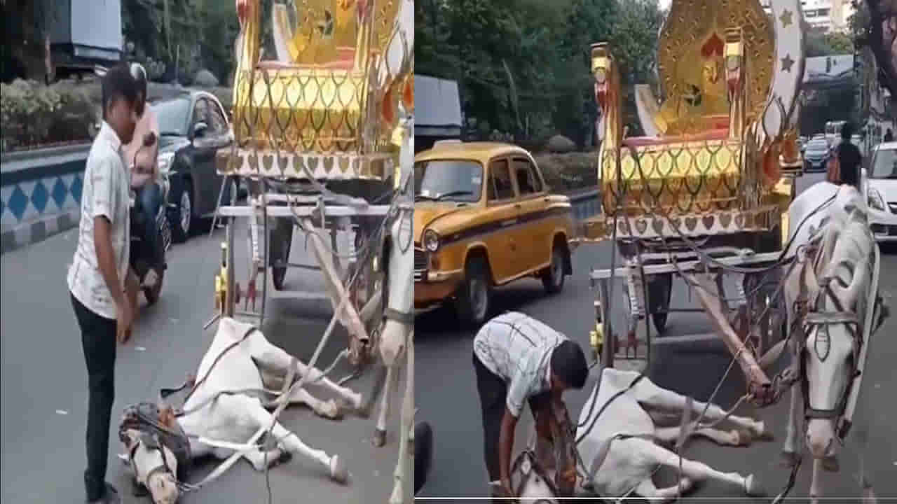 దేశంలో రోజురోజుకు ఎండలు మండిపోతున్న వేల.. ఎండ వేడికి తట్టుకోలేక దాహంతో అలసిన ఓ గుర్రం.. బండిని లాగలేక నిస్సహాయ స్థితిలో కుప్పకూలి పడిపోయిన వీడియో ప్రస్తుతం అందరినీ కలచివేస్తోంది. వివరాల్లోకి వెళితే.. కోల్కతా నగర వీధుల్లోని రోడ్లపై ఓ గుర్రం బండి వెళ్తోంది. ఆ గుర్రం బండిని రెండు గుర్రాల్లు లాక్కొన్ని వెళ్తున్నాయి. ఈ క్రమంలో ఓ గుర్రం ఎండ వేడికి తట్టుకోలేక దాహంతో అలసిపోయి, గుర్రపు బండిని లాగలేక ఒక్కసారిగా రోడ్డుపైనే కుప్పకూలిపోయింది. అయితే ఆ గుర్రానికి నీళ్లు పోసి దాహం తీర్చాల్సిన యజమాని మాత్రం దాని పట్ల క్రూరంగా ప్రవర్తించారు. దాన్ని కొడుతూ బలవంతంగా తాడుతో లాగుతూ లేపే ప్రయత్నం చేశాడు. కానీ అప్పటికే ఒంట్లో శక్తి లేక సొమ్మసిల్లి పడిపోయిన గుర్రం లేవలేక పోయింది. అయితే ఇందుకు సంబంధించిన వీడియో ప్రస్తుతం సోషల్ మీడియాలో వైరల్గా మారింది.