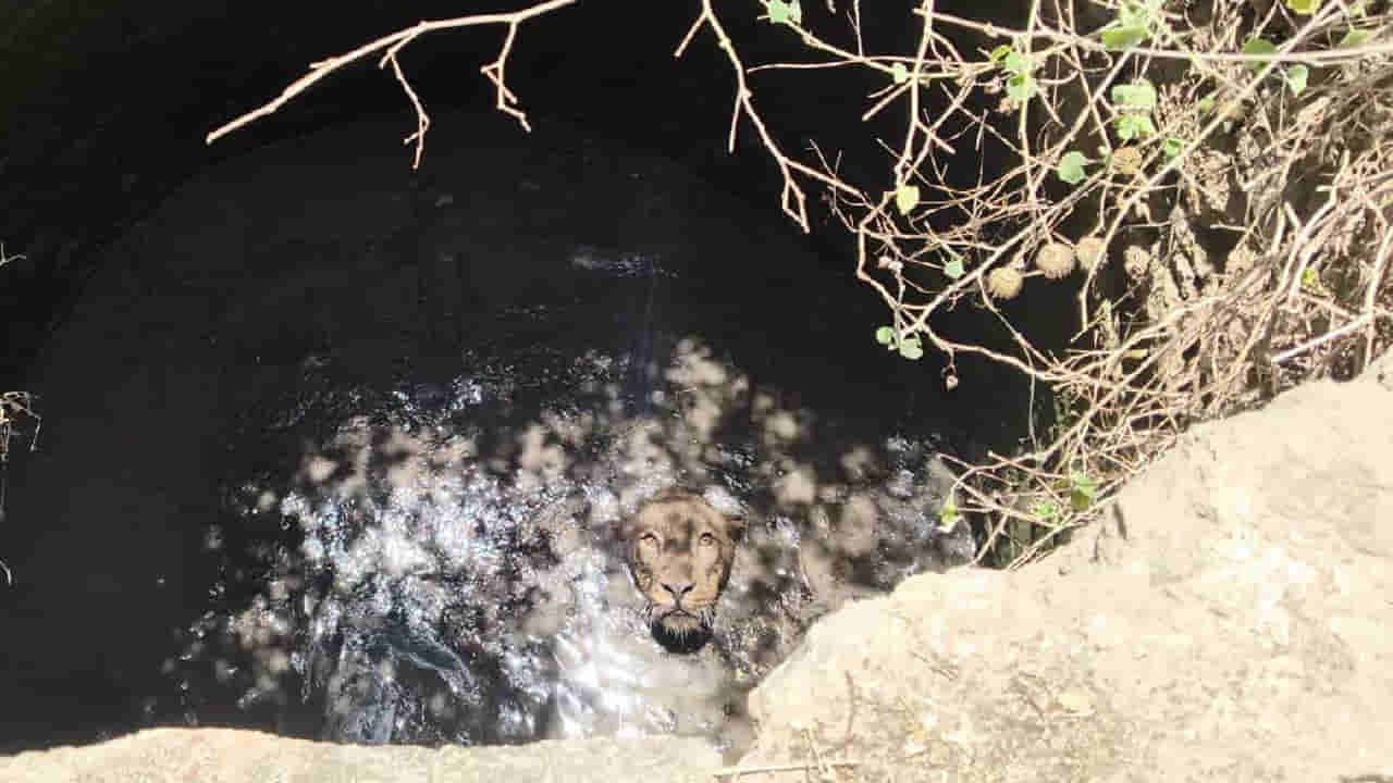 Near the forested stretch of Navabandar in Una taluka, a majestic lion, likely in search of prey, accidentally fell into an open farm well.