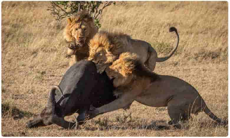 నలుగైదింటికి సరిపడా ఆహారం ఉంది. అయితే ఏం లాభం.. తెలివి లేకపోతే. అది ఆఫ్రికా ఖండంలోని క్రుగేర్ జాతీయ పార్క్. అందులో ఉన్న సింహాలు బాగా ఆకలితో ఉన్నాయి. అయితే అదే సమయంలో ఓ బర్రెల గుంపు వాటికి కనిపించింది. సామాన్యంగా మృగరాజులను చూడటంతోనే మిగతా జంతువులు ప్రాణరక్షణ కోసం పరిగెడుతాయి. అది సాదారణమైన విషయమే. అయితే ఓ బర్రె మాత్రం ఆ మృగరాజులకు చిక్కింది. ఇంకేముంది ప్రాణాలపై ఆశలు కోల్పోయింది. ఆ బర్రెను నాలుగైదు సింహాలు బంధించాయి. ఇక అక్కడ ఉన్న ఇతర జంతువులు ఇక బర్రె పని అయిపోయిందనుకున్నాయి. అయితే సింహాల్లో లోపించిన ఐకమత్యం ఆ బర్రెకు ప్రాణబిక్ష చేసినట్టైంది. ఆకలితో ఉన్న ఆ సింహాలు.. బర్రెను ఈడ్చుకొచ్చాయి. ఇక భక్షించేందుకు అన్ని గుమిగూడాయి. అదే సమయంలో ఓ రెండు సింహాల మధ్య ఆదిపత్య పోరు చోటుచేసుకుంది.