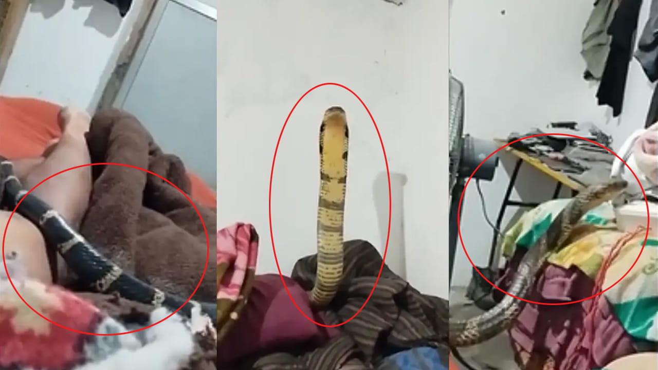 వీడియోలో, ఒక వ్యక్తి తన పడుకున్న మంచం మీద నెమ్మదిగా కదులుతున్న భారీ కింగ్ కోబ్రాను చాలా కూల్గా రికార్డు చేస్తూ కనిపించాడు. భయపడి కదలకుండా.. వేగంగా తప్పించుకునే బదులు అతడు పాము కదలికను ఆసక్తిగా, రిలాక్స్గా చిత్రీకరించాడు.