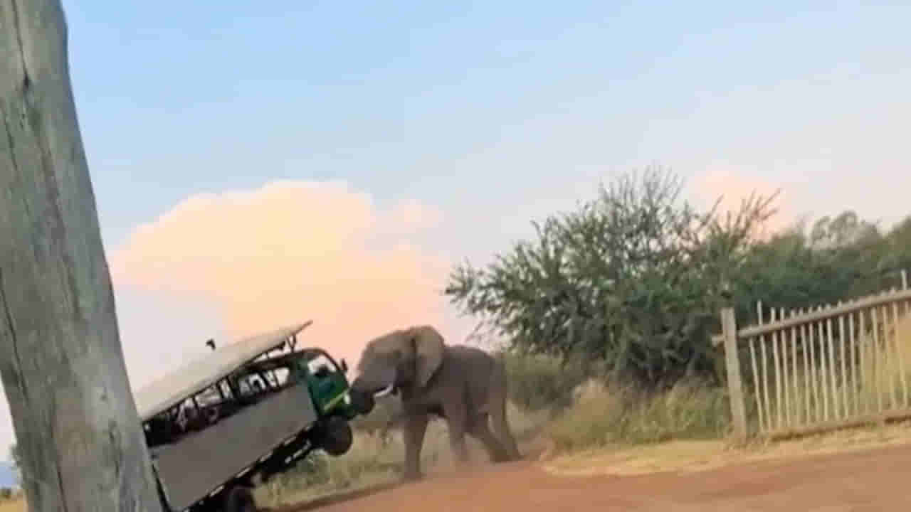 తన తొండంతో ముందు భాగాన్ని పైకి లేపి, దానిని నేలపై పడేస్తుంది. ఈ ఘటనతో టూరిస్టులు ఒక్కసారిగా షాక్ అయ్యారు. దీంతో కాపాడాలంటూ కేకలు వేశారు. ఆ తర్వాత డ్రైవర్ చాకచాక్యంగా వ్యవహరించడంతో ప్రమాదం తప్పినట్టయింది. గైడ్ వాహనాన్ని వెనక్కు తిప్పి ఏనుగును నుంచి తప్పించుకున్నాడు. ఈ ఘటనపై అక్కడి పర్యాటకులు మాట్లాడుతూ ఏనుగు చాలా క్రూరంగా వ్యవహరించిందని, ఒక్కసారిగా దూసుకురావడంతో ఏం చేయాలో అర్ధం కాలేదన్నారు. ఏనుగు దాడిలో ఎవరికీ గాయాలు కానప్పటికీ, ఆందోళనకు గురైన వారికి కౌన్సిలింగ్ ఇచ్చారు. ప్రస్తుతం ఏనుగుకు సంబంధించిన వీడియో సోషల్ మీడియాలో వైరల్ అవుతోంది.