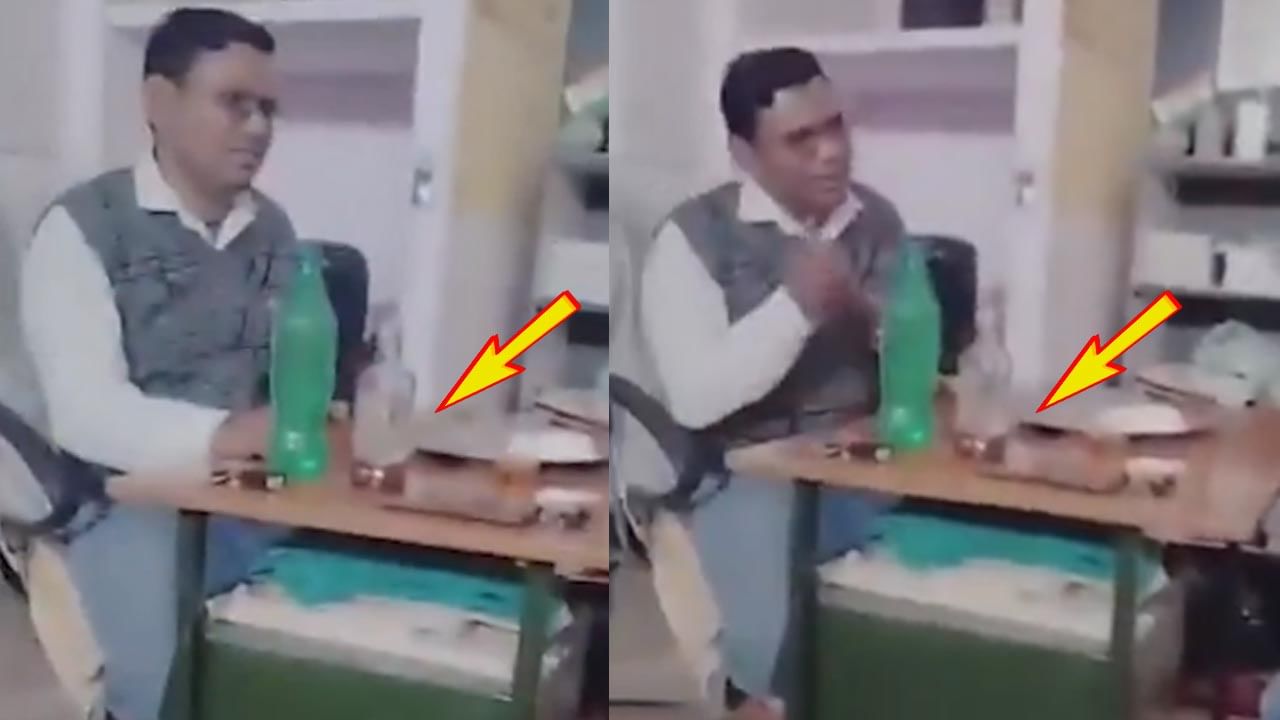दो शिक्षक स्कूल के अंदर ही शराब पीते नजर आ रहे हैं।