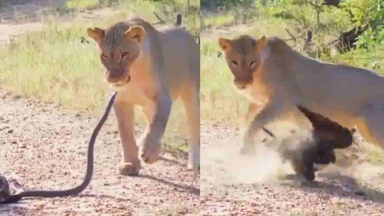 వాస్తవానికి ఈ వీడియోలో విషపూరిత నల్ల తాచు, డేగ మధ్య పోరాటం జరిగినట్లు కనిపిస్తుంది. అప్పుడు అకస్మాత్తుగా ఒక సింహం అక్కడకు ప్రవేశిస్తుంది. అక్కడ ఉన్న పరిస్థితిని గమనించిన సింహం గద్దను పాము నుంచి రక్షించేందుకు డిసైడ్ అయితుంది. పాము భయపెట్టాలని చూసినా ఏ మాత్రం జంకకుండా అదను చూసి ఒక్క పంజా విసురుతుంది.