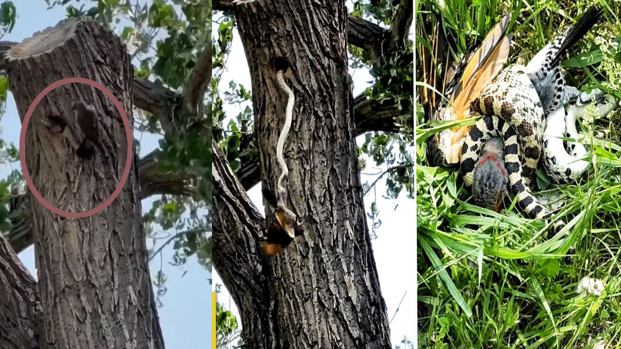 వీడియోలో ఒక పాము పక్షి గూటిలోకి ప్రవేశించి అందులో ఉన్న పక్షి గుడ్లను తినాలని ప్రయత్నం చేస్తుంది.. అక్కడికి వచ్చిన తల్లి పక్షికి పాము చేస్తున్న పని అర్ధం అయింది. తన పిల్లలను కాపాడుకోవడానికి పాముని గూటి నుంచి బయటకు రప్పించే ప్రయత్నం చేసింది. పాముతో పక్షి పోరాడింది. అంతేకాదు పాము తన పిల్లవైపు చూడానికి కూడా లేకుండా చేసింది. అయితే పాము పక్షిపై దాడి చేయడంతో చెట్టు నుంచి పాముతో పాటు పక్షి కిందకు పడ్డాయి. పాము కరవడంతో పాటు పక్షిని చుట్టి ఊపిరి ఆడకుండా చుట్టేసి చంపేసింది. అయితే ఆ పక్షి తాను మరణిస్తూ కూడా తన గుడ్లను కాపాడుకుంది.