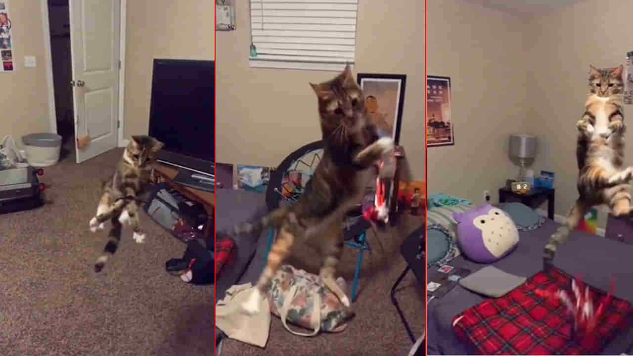Viral Video: రకరకాల వీడియోలో సోషల్ మీడియాలో వైరల్ అవుతూనే ఉంటాయి. ఎక్కవుగా పాములు, మొసళ్లు, పులులు, ఇతర జంతువుల వీడియోలు సోషల్ మీడియాలో తెగ వైరల్ అవుతుంటాయి. ఇక ఇక్కడ మాత్రం ఓ పిల్లిని చూస్తే మీరే ఆశ్చర్యపోతారు. ఆ పిల్లి గాల్లో ఎగుతున్న వస్తువులనే సైతం ఇట్టే పట్టేసుకుంటోంది.