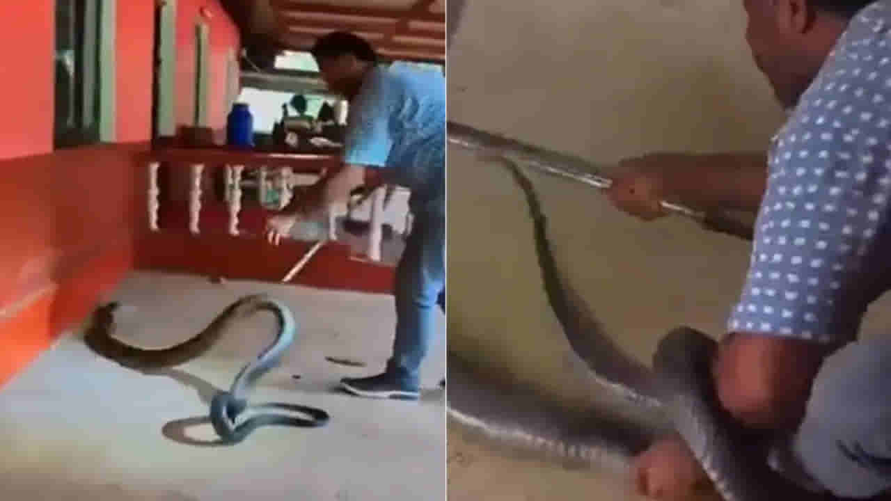 ఈ మధ్యకాలంలో సరీసృపాలు తమ ఆవాసాలను వదిలేసి.. జనావాసాల్లోకి వస్తున్న సంఘటనలు మనం చూస్తూనే ఉన్నాం. సాధారణంగా చిన్న పామును చూస్తేనే గుండె జారినంత పనవుతుంది. అదే కింగ్ కోబ్రా లాంటి విషసర్పాన్ని దగ్గర నుంచి చూస్తే ఇంకేమైనా ఉందా.? పైప్రాణం పైకే పోతుంది. ఈ కింగ్ కోబ్రా విషం.. క్షణాల్లో మనిషిని చంపేస్తుంది. తాజాగా ఓ కారు సీటు కింద దూరింది 15 అడుగుల భారీ కింగ్ కోబ్రా.. దాన్ని చూడగానే ఒక్కసారిగా ఓనరు మైండ్ బ్లాంక్ అయింది. వెంటనే తేరుకుని స్నేక్ క్యాచర్కు సమాచారం అందించాడు. అతడు అక్కడికి చేరుకొని సుమారు 2 గంటల పాటు కష్టపడి.. ఆ పెద్ద కింగ్ కోబ్రాను చాలా శ్రమపడి మరీ పట్టాడు. ఆ తర్వాత తీసుకెళ్లి అటవీ ప్రాంతంలో విడిచిపెట్టాడు.